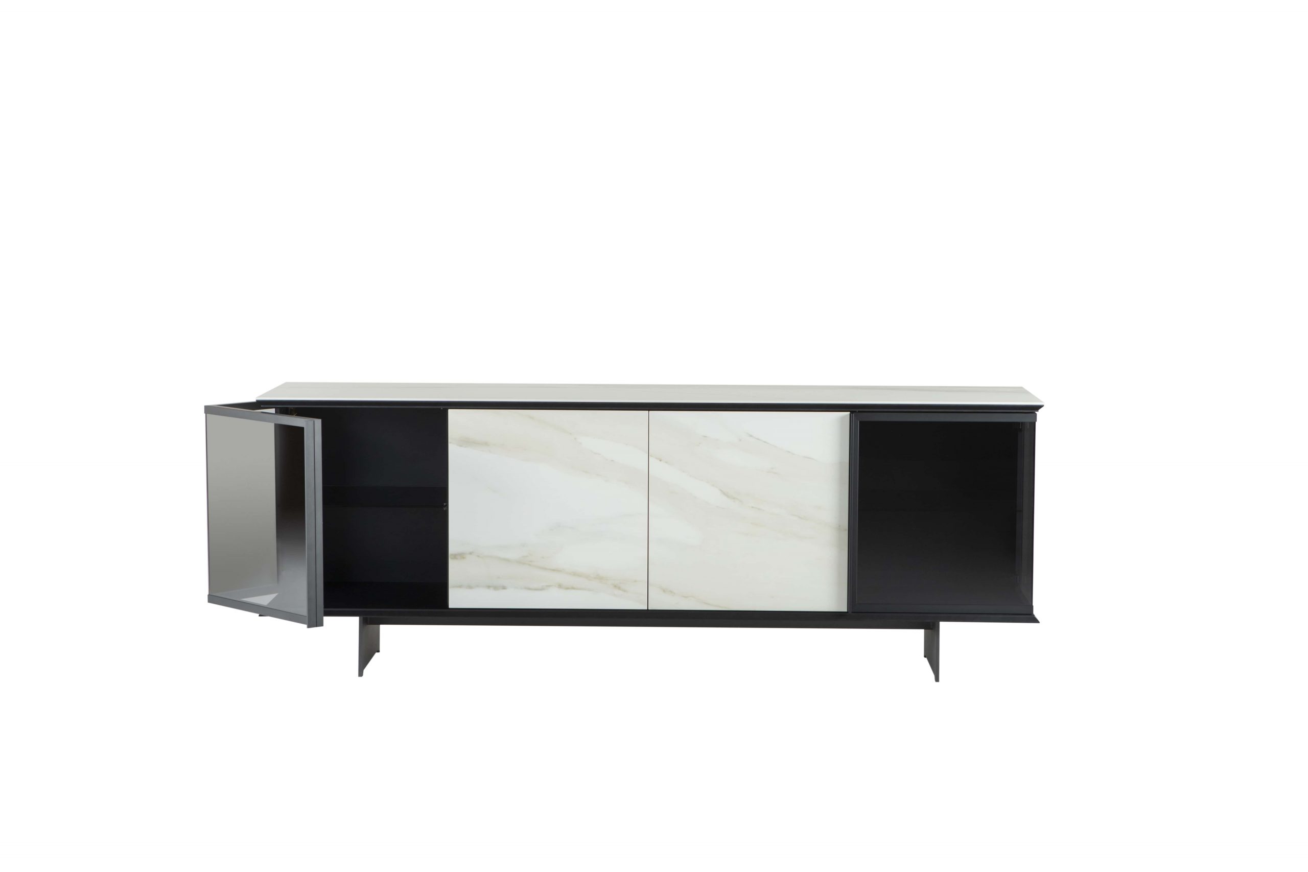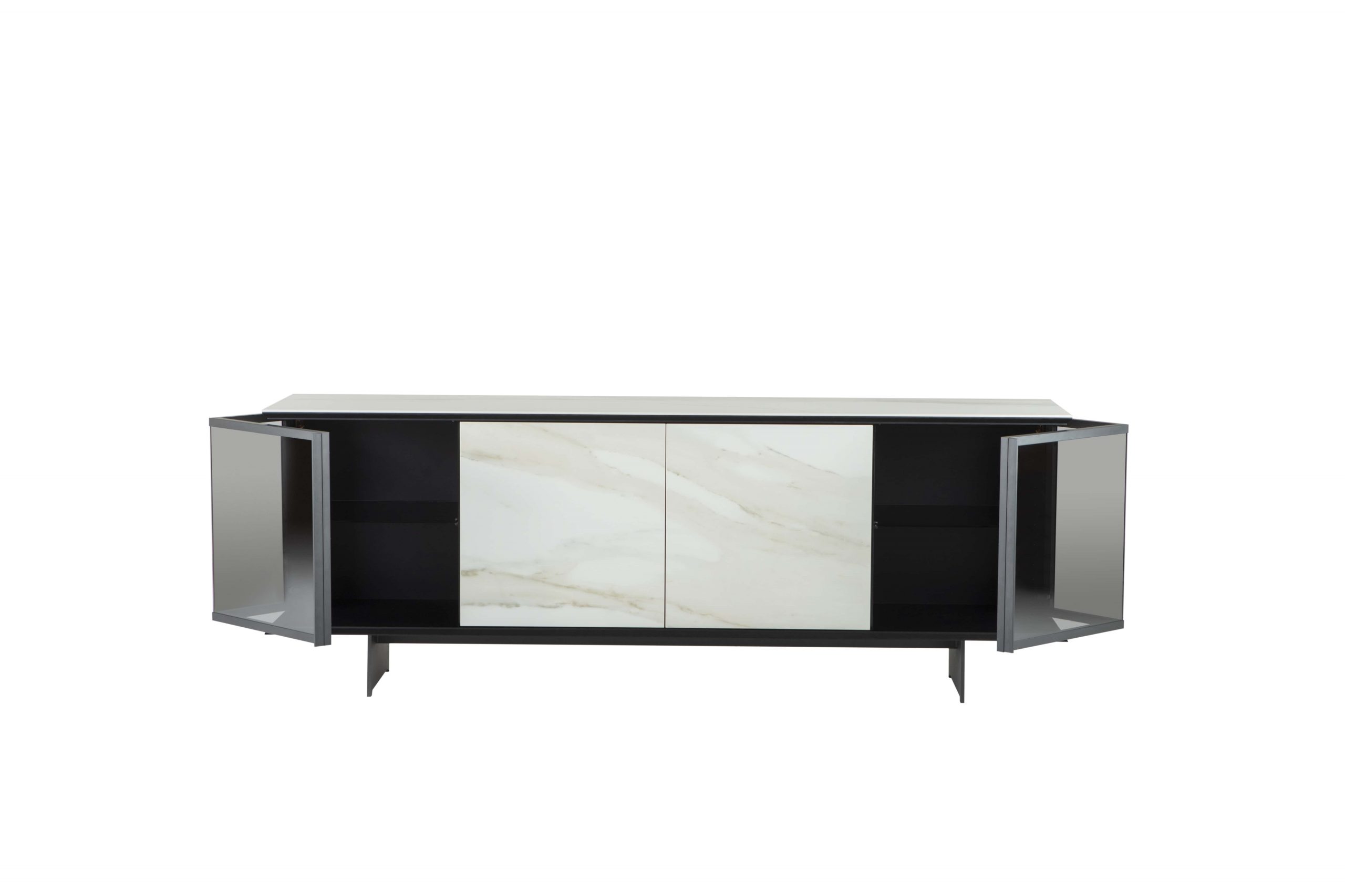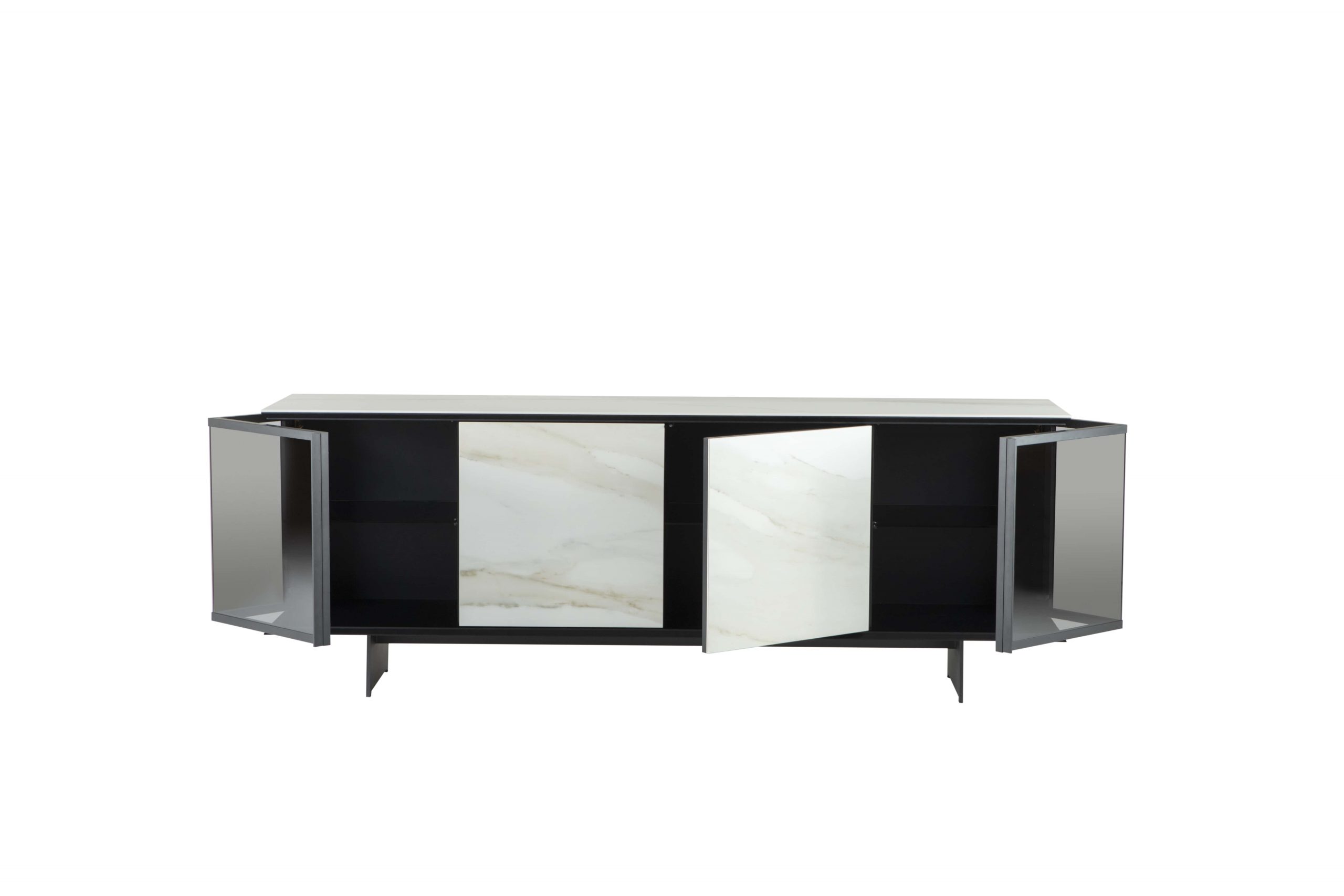 The word Aira derives from Arabic and means “shining”, an adjective that is well suited to the refined elegance of this sideboard which, made with porcelain stoneware doors and equipped with internal leds, is able to make shine any living space. The unpublished lateral opening of the two windows placed on the sides of the sideboard gives a precise identity to its exclusive design Sideboard with hinged opening. Structure in lacquered melamine with porcelain stoneware and glass doors; base in lacquered metal*