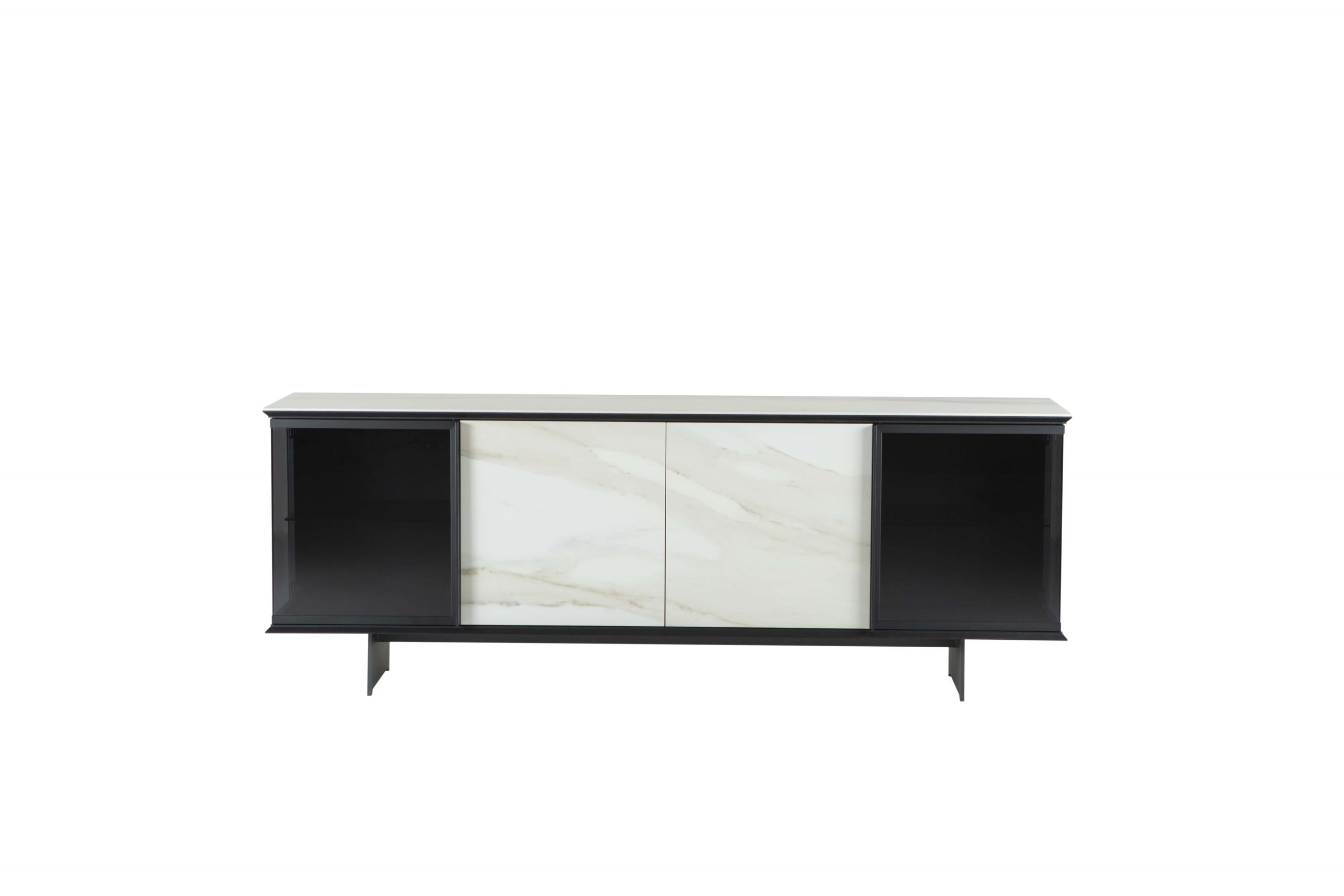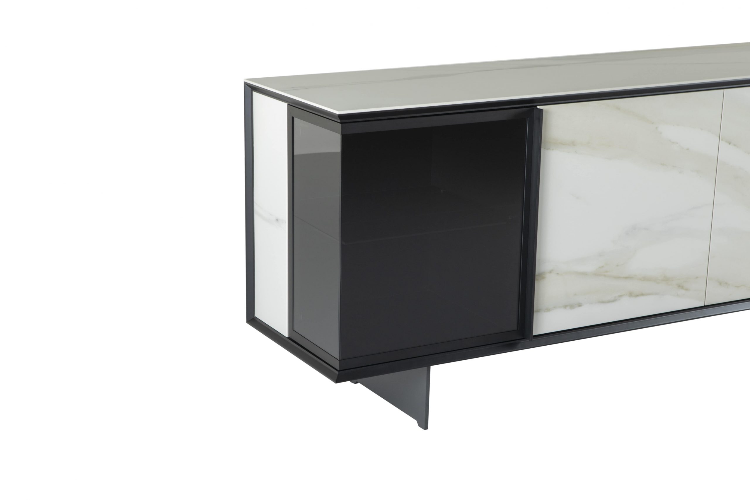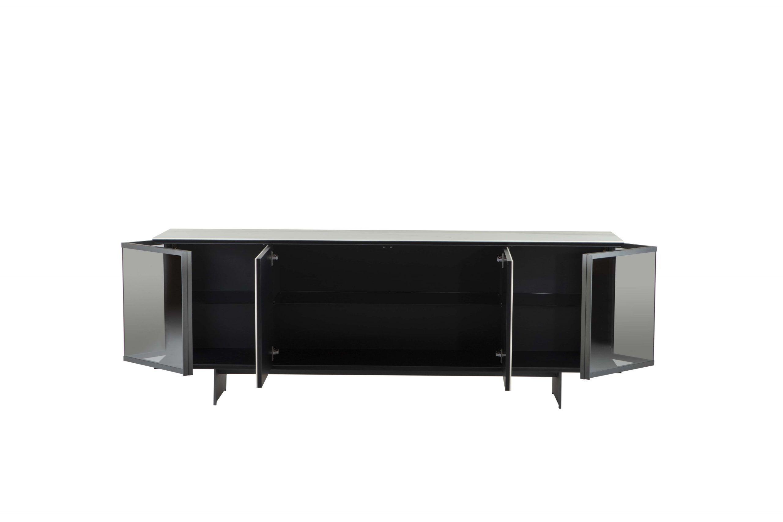 The word Aira derives from Arabic and means “shining”, an adjective that is well suited to the refined elegance of this sideboard which, made with porcelain stoneware doors and equipped with internal leds, is able to make shine any living space. The unpublished lateral opening of the two windows placed on the sides of the sideboard gives a precise identity to its exclusive design Sideboard with hinged opening. Structure in lacquered melamine with porcelain stoneware and glass doors; base in lacquered metal*