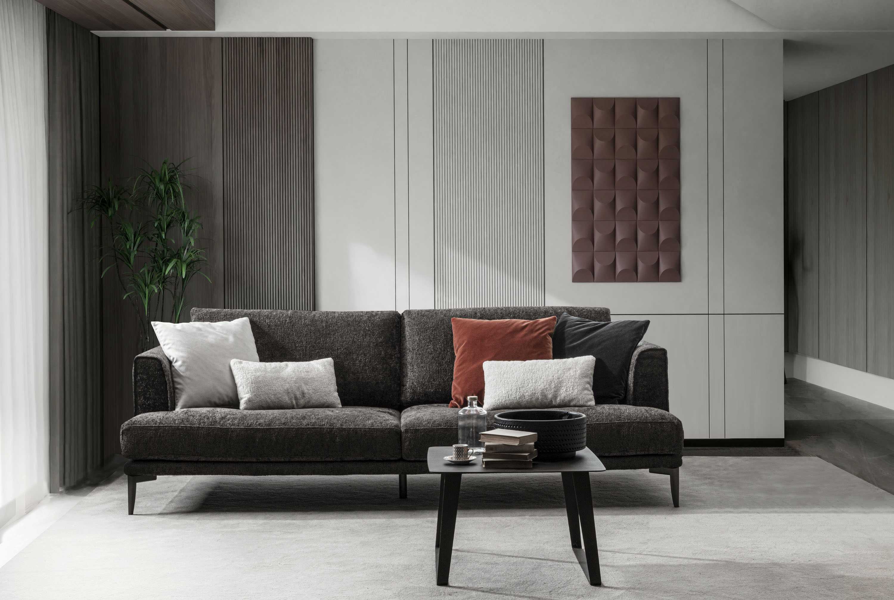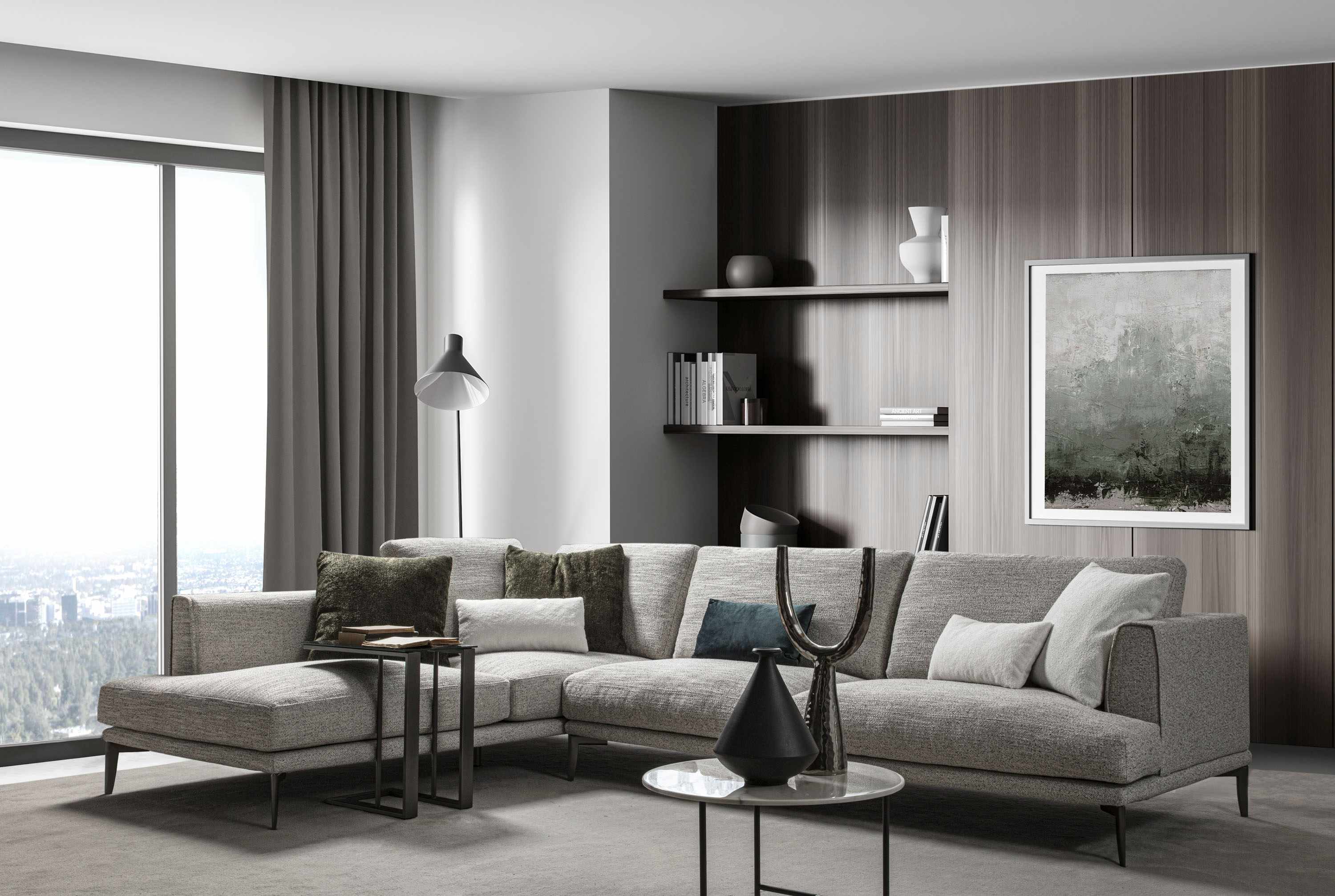 Structure in solid wood and by-products with an interwoven elastic belt suspension and padding in differentiated density polyurethane foam, all covered in white velvet. Seat cushions in polyurethane foam (D30), coupled with a quilt in real down, all covered in down-proof fabric. Back cushions in FILPIUMA (special soft and hypoallergenic blend composed of real down and hollow silicone fiber) with polyurethane foam insert, all covered with down-proof fabric. Completely removable fabric covers. Single feet in polished metal or sled base, matt medium gray painted.