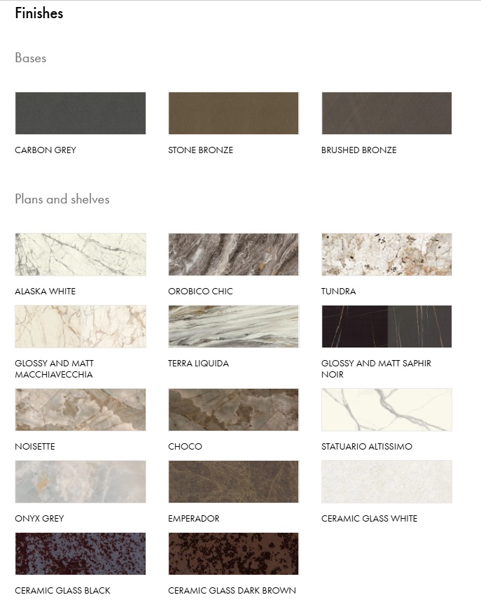| Metal base | Brushed bronze, Brushed cooper, Brushed titanium, Matt white, Stone bronze, Carbon grey |