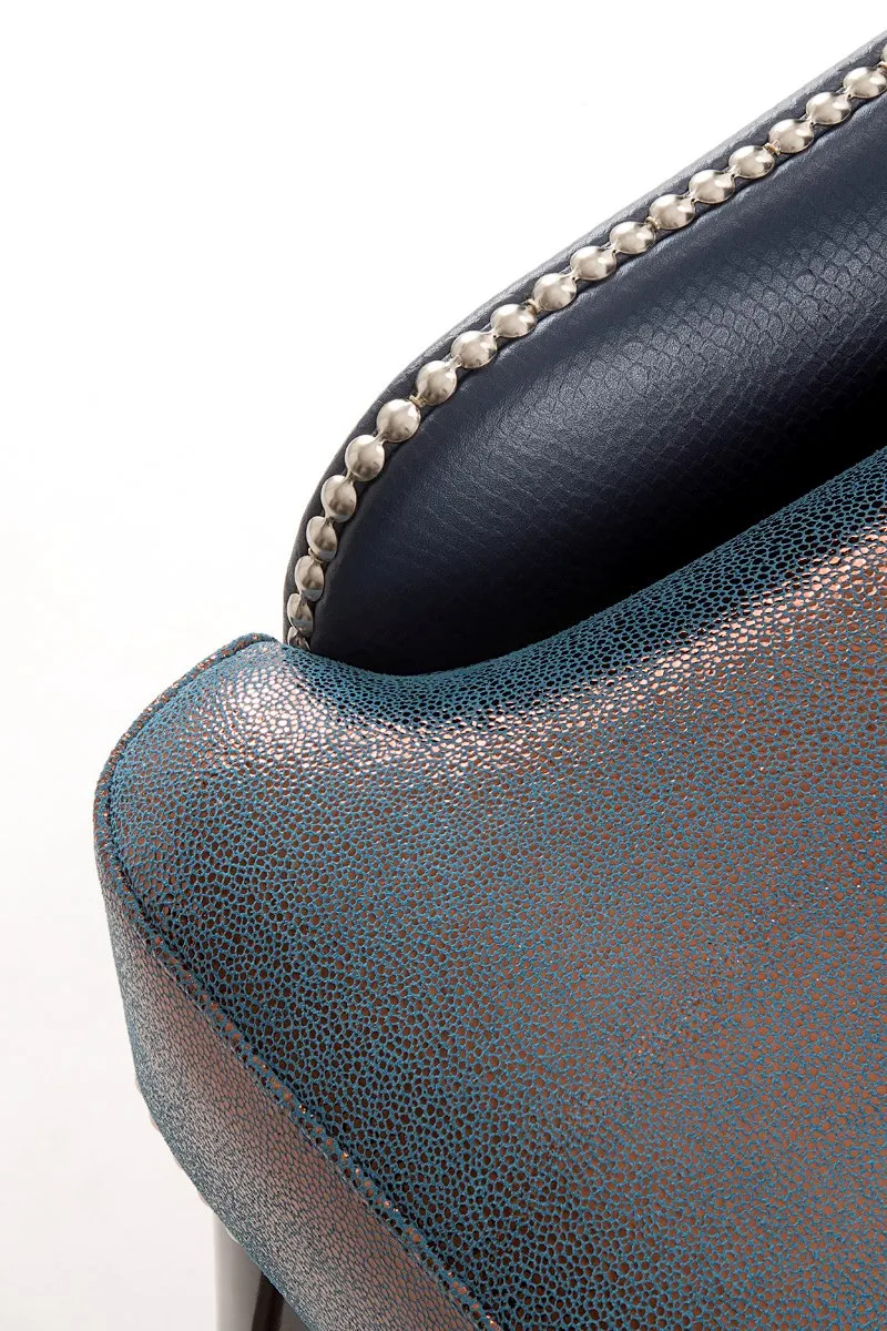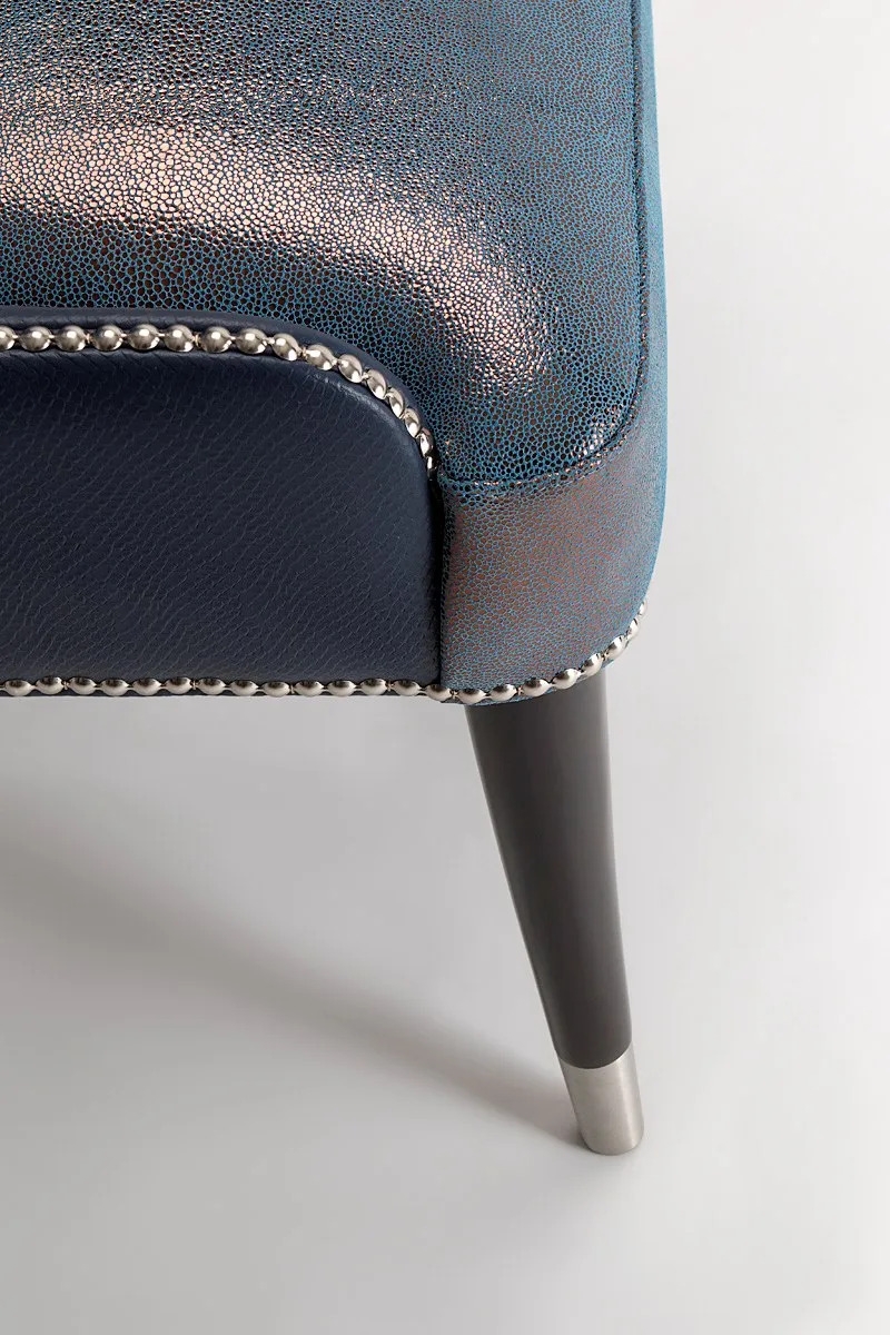 Available also as a side chair and bar stool, this stylish lounge chair provides great comfort and a sophisticated touch to any interior, especially when paired with matching pieces. Its solid wood frame also ensures strength and durability, suitable for hotel lounges, bars, and grand settings. Thanks to the wide range of fabrics, metal caps, studs, and wood stains this product can be a perfect match with any interior space.The armchair is a lovely, long-lasting piece of furniture, suitable for both residential and hospitality interiors.