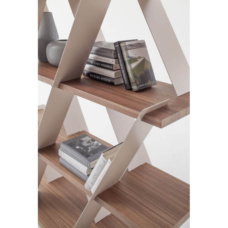 An original idea among the collection proposed and signed by ToninCasa: Castle the bookcase. Castle’s design plays with metal and wood, reminding of a house of cards. The design is modern and simple, but has a great effect on furniture. Bookcases 2 sizes matt white lacquered , Stone bronze,carbon grey, or matt gold or metal finishing, and Dark oak, Canaletto walnut, Black ash or Natural oak shelves.