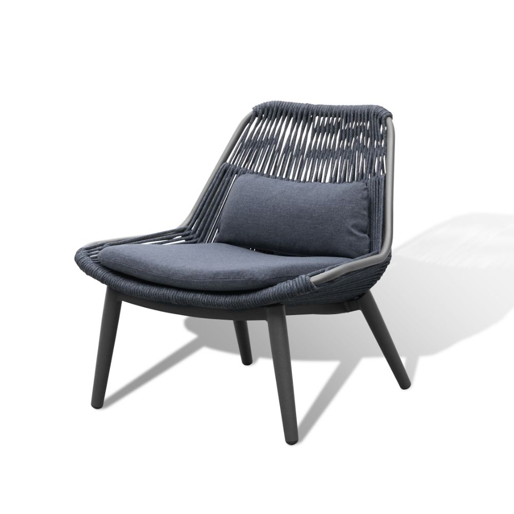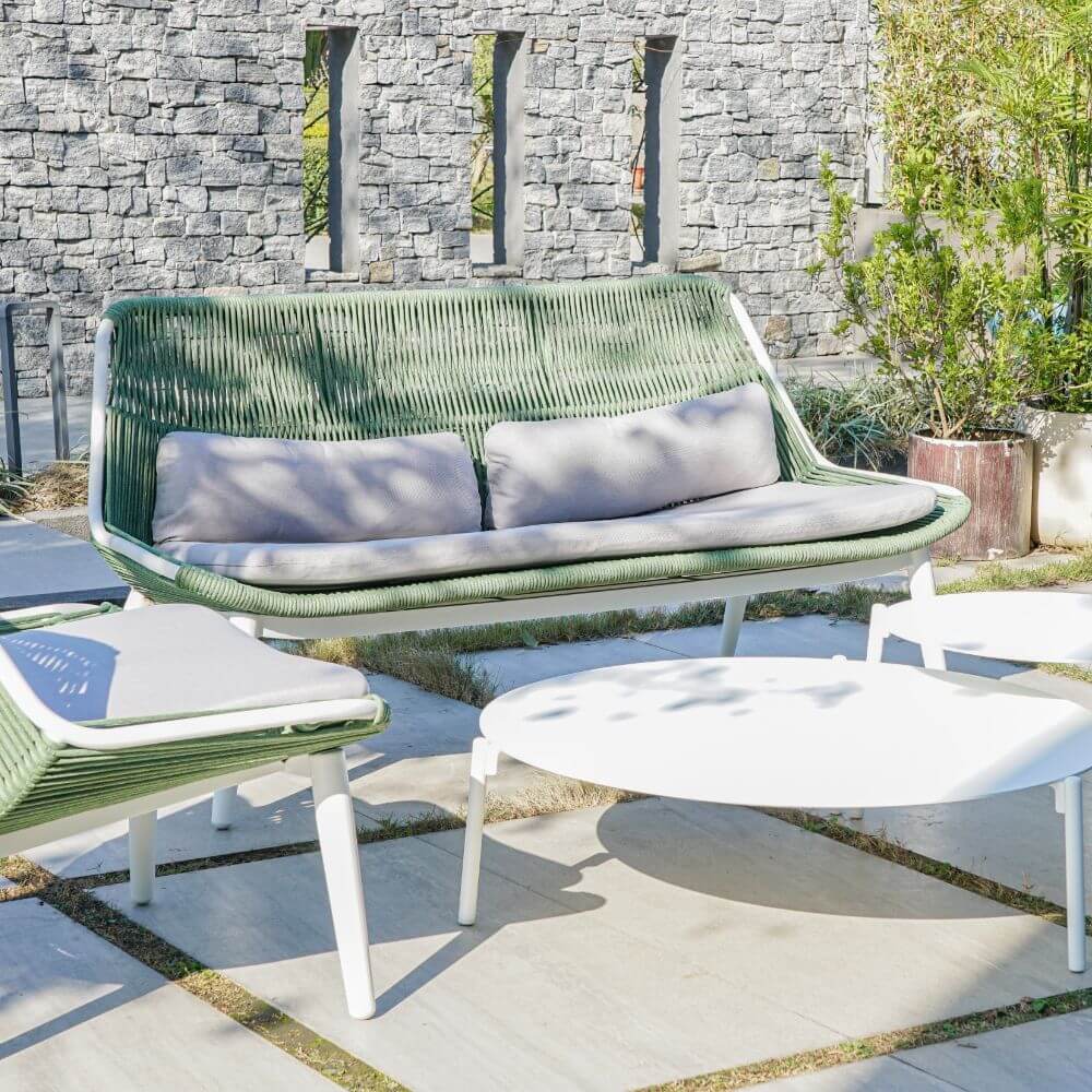 The Como aluminium garden sofa covered with Ø 9 mm acrylic rope, and a table with aluminium top. Upholstered cushions with acrylic fabric. Without armrests, it has an aluminum structure. Seat and back are crossed by polyester cords , which follow a particular pattern. The model is made comfortable by the cushions and headrest , all with removable covers .