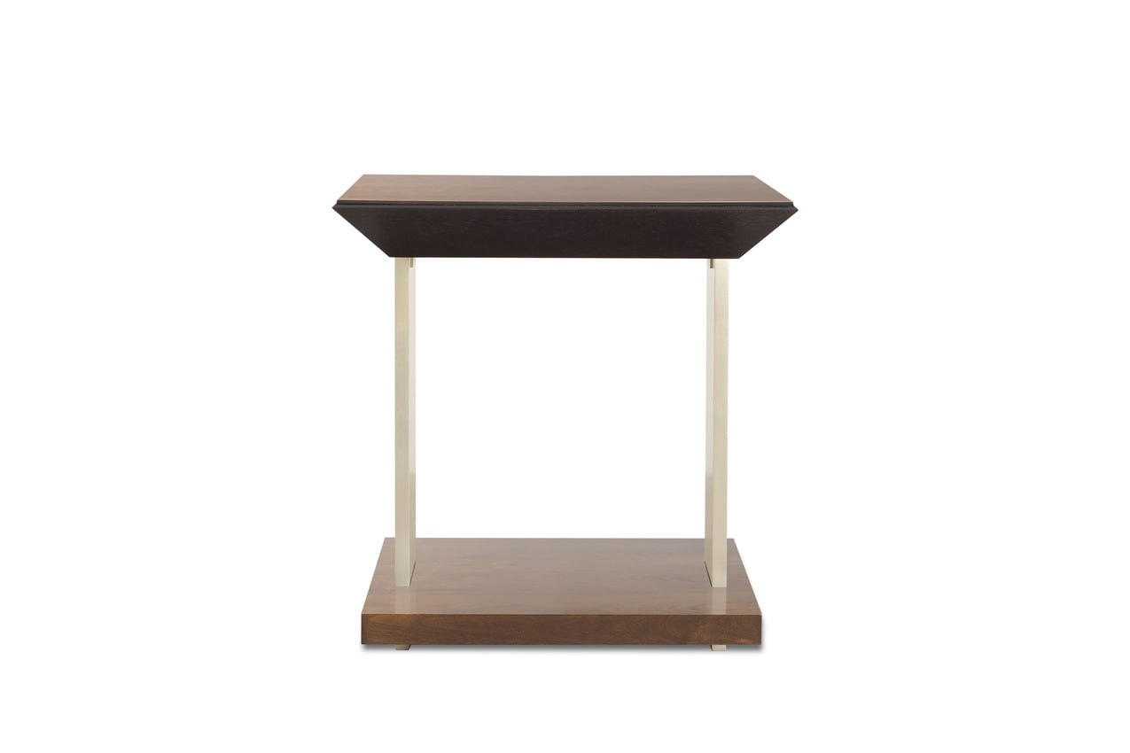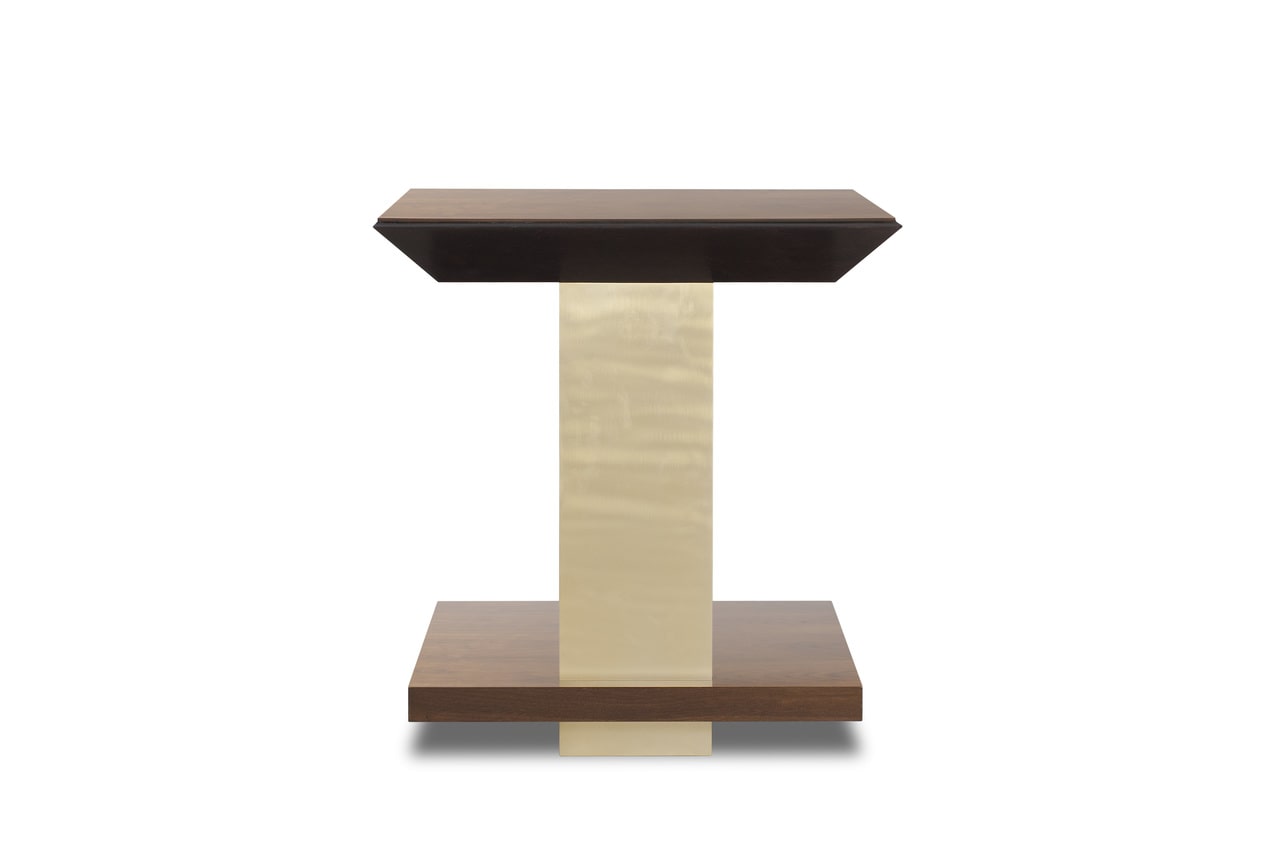 Coral Center Tables are inspired by geometric design and have metallic details. There are two different sizes available. There are a number of top and base finish combinations available including a walnut oak finish, or a lacquered finish with any other finish.