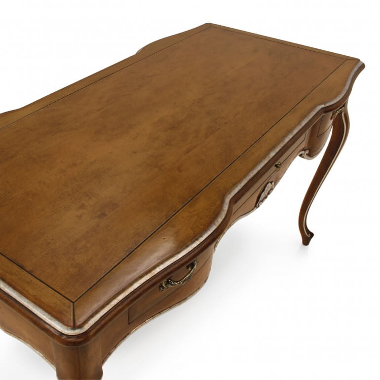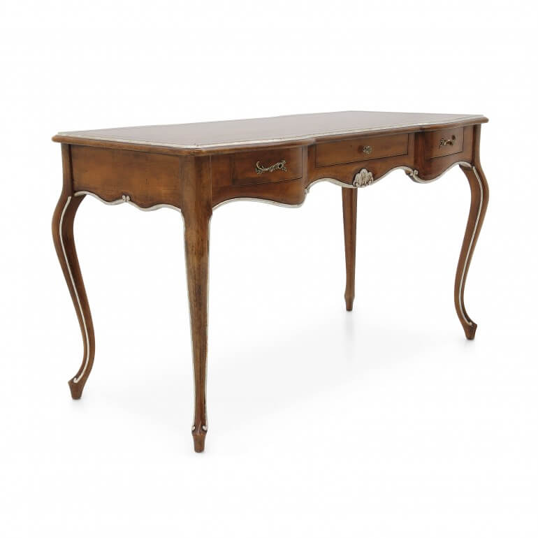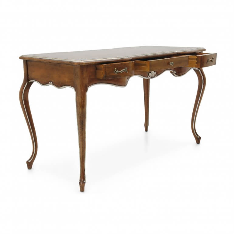Elegant classic style writing desk Damide with beech wood structure.Equipped with three drawers, it has important sinuosities that stand out particularly. It has a profile to be highlighted with a gold leaf or silver leaf lacquer that enhances its elegance.