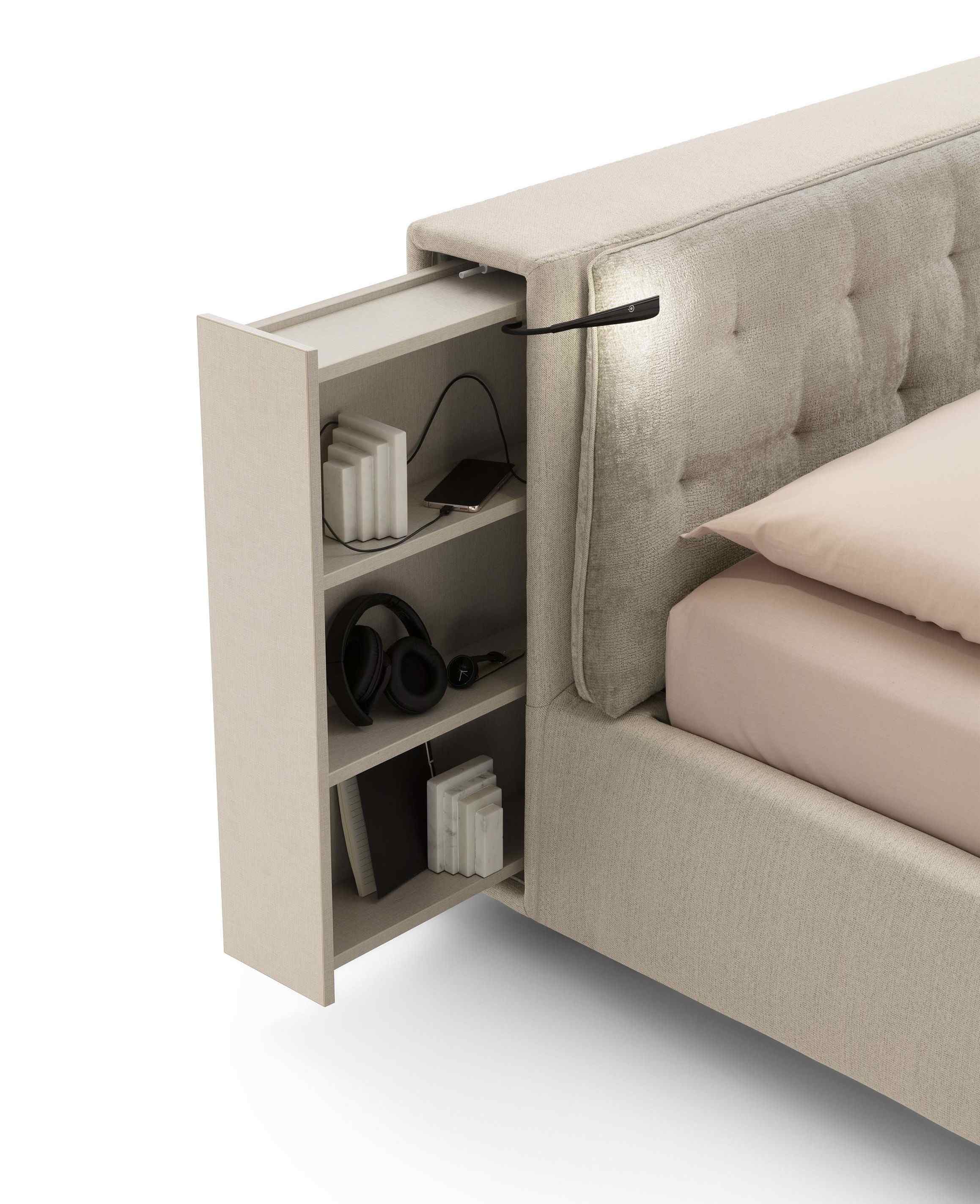 Headboard with an extractable bookcase. Extractable lights with USB connection. Touch control lighting 2 intensity.