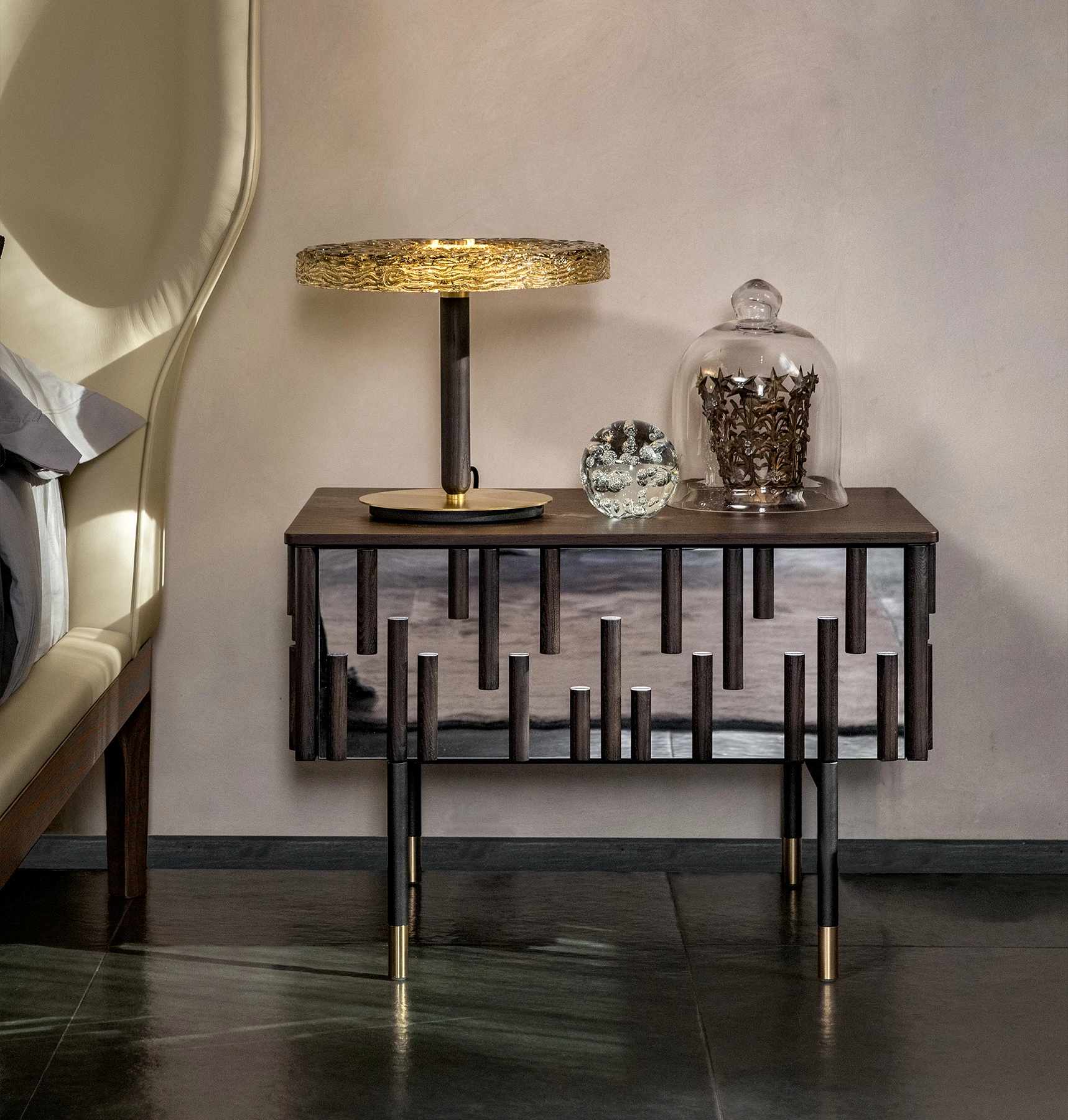 A complete and extremely elegant day program and night group. Solid wood drops were applied with extreme care to the mirror-effect doors. A fine and sophisticated, shaped and rounded top; a metal frame with gold-finish inserts. All this to leave nothing random. Drawers and dresser with bronzed or silver mirror finishing doors, solid wood decorative elements, and dark oak top, carbon grey metal frame, and faux brass feet.
