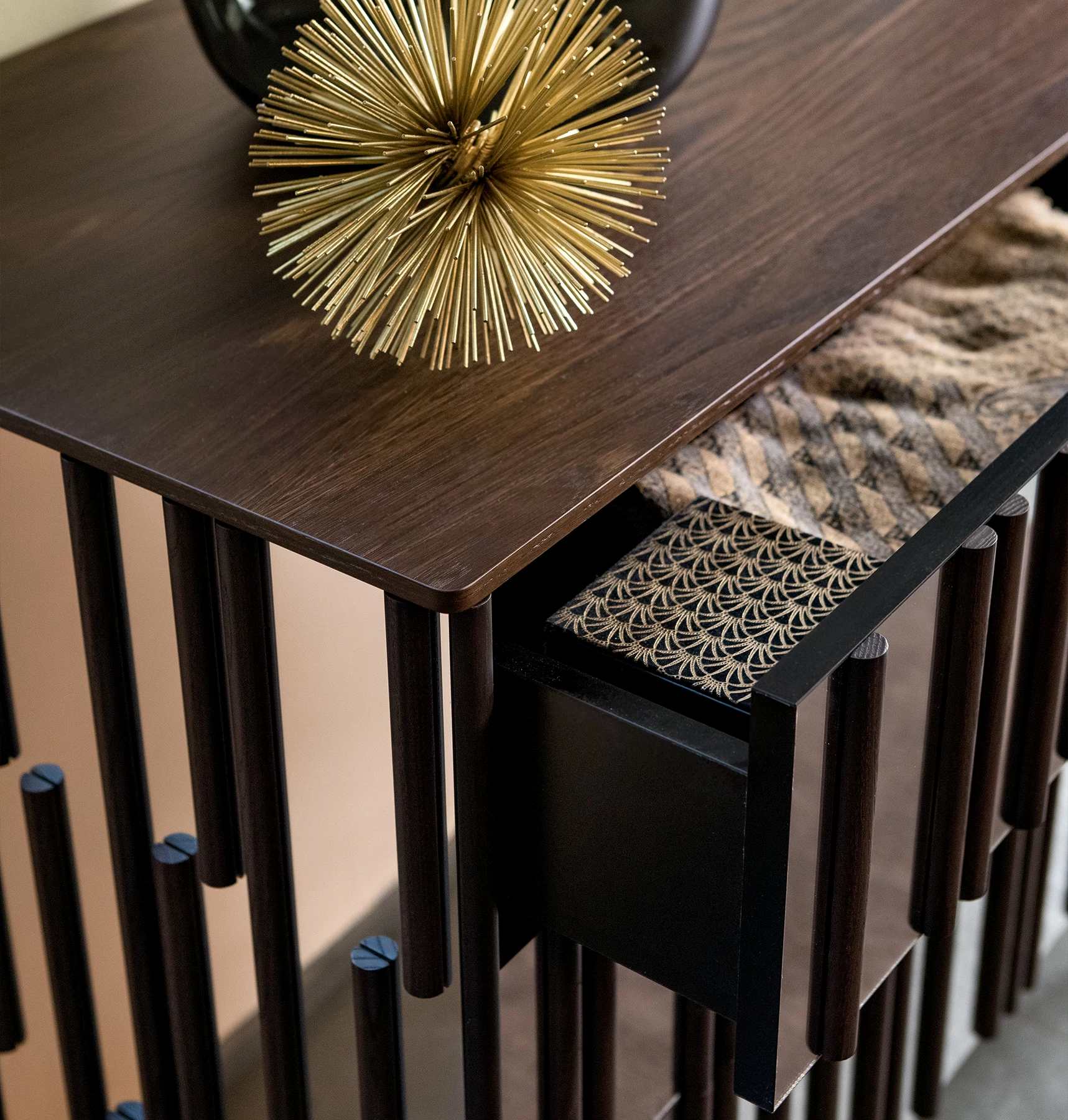 Wooden TV stand with 3 mirror-effect PMMA drawers/sides and wood inserts. Metal base lacquered Carbon grey with brass foot.