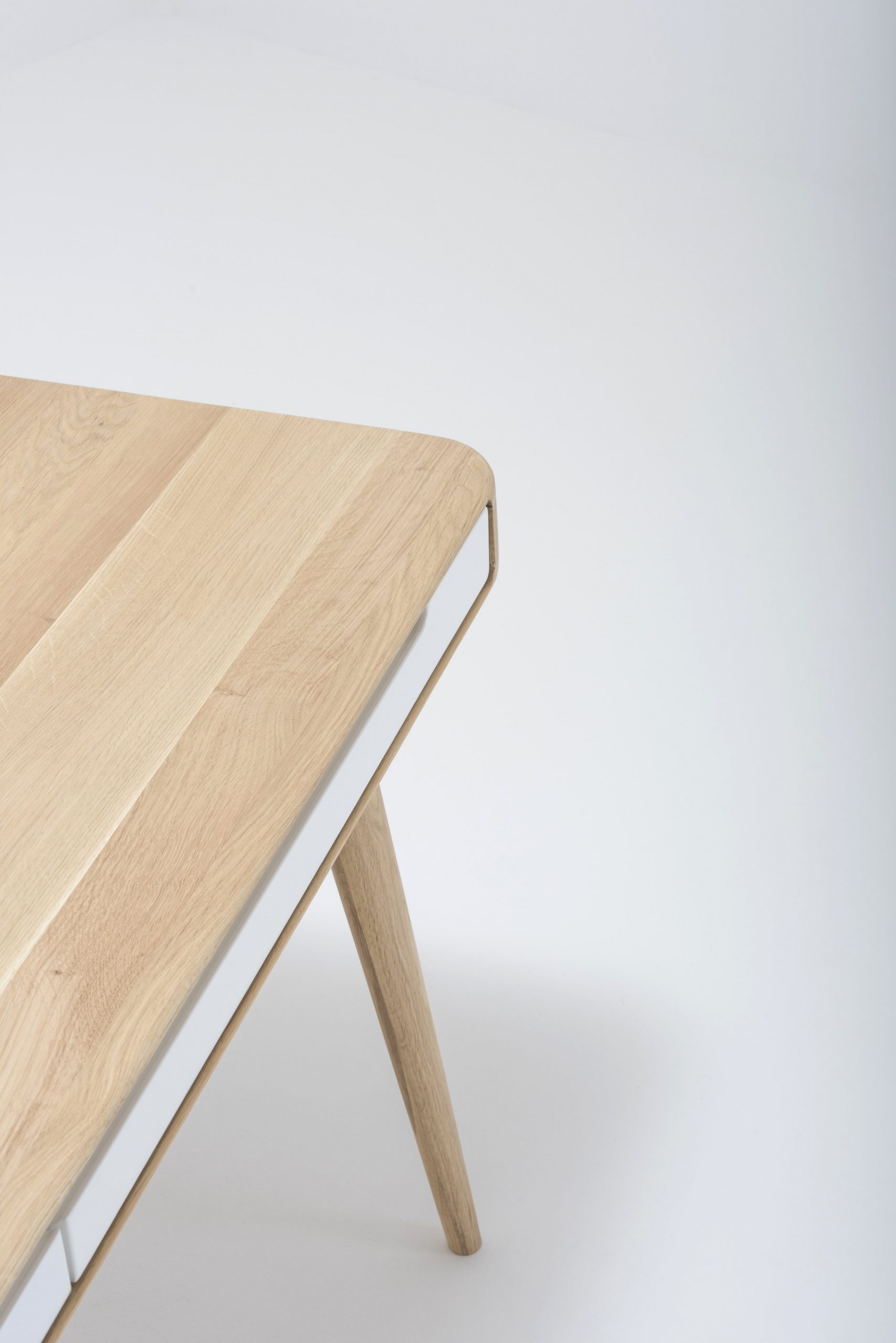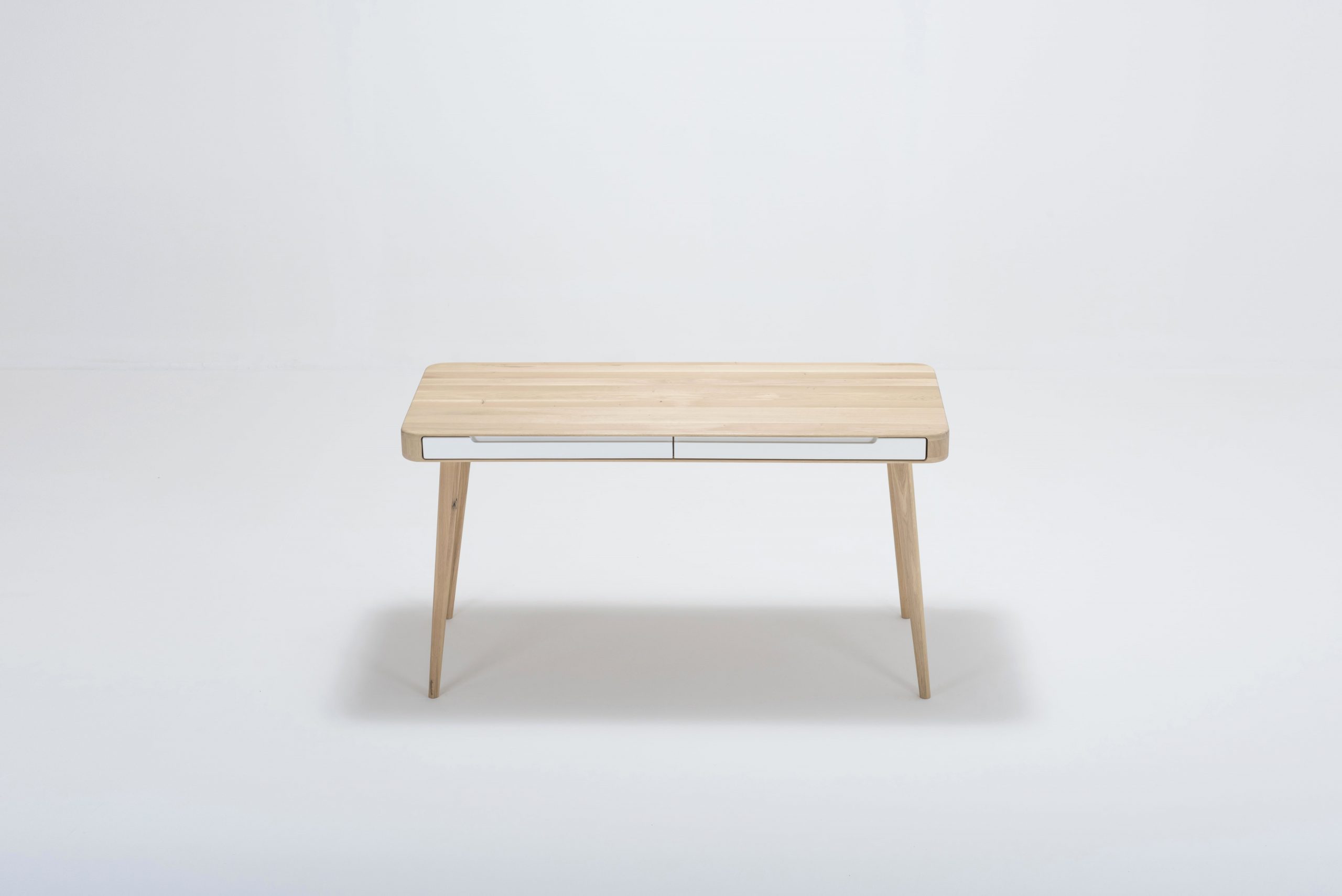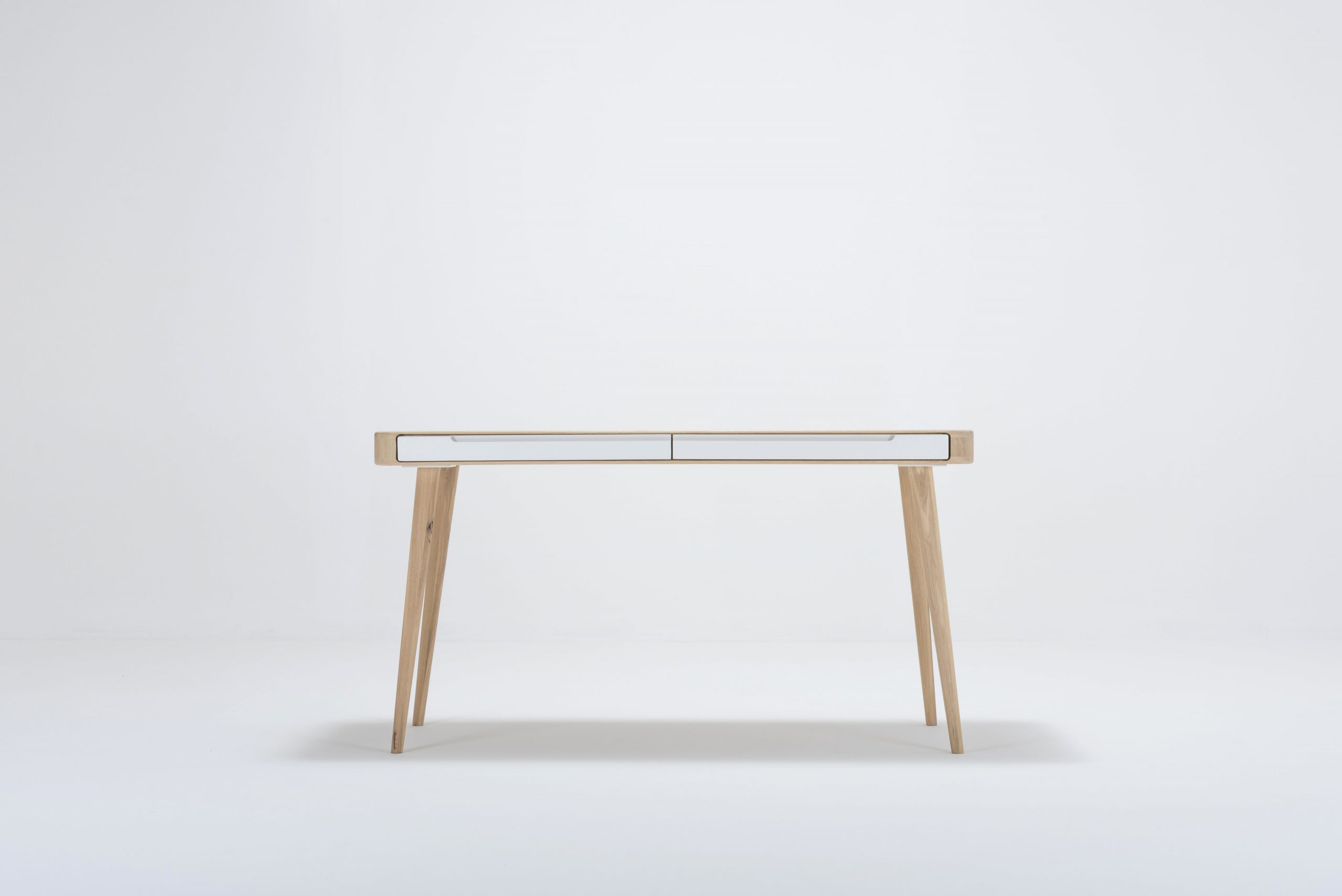 Ena desk sleek, yet strong tabletop comes in timeless solid oak and 2 drawers MDF – White 9010.