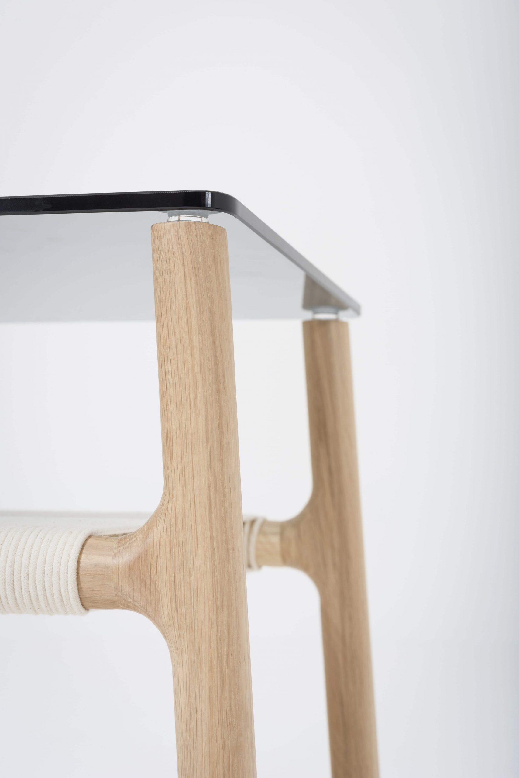Fawn’s side table light frame is fully made out of solid wood – oak. The front and back frame sides are connected with a white elastic cotton rope which serves as a horizontal divider. Tables have an additional steel rod stiffener in the middle wrapped in the cotton rope.