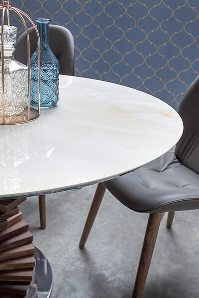 Firenze table’s main characteristic regards its base: it is made with solid Canaletto walnut, or solid dark oak slats. The slats are paired one by one, forming a spiral sculpture that creates an elegant optical illusion. A glass top, available in different sizes, completes the structure. ToninCasa’s originality, mixes precision, quality and practicality: the table, in fact, is available with both the single and the double base. Just like a spiral staircase reflecting a lake, lightly hovering, a piece of art you can use in your everyday life: Firenze combines warmth, sobriety and inventiveness. Precision in positioning every solid wood slat is the rightful reason for Tonin Casa’s artisans to feel proud. Fixed table: solid wood structure(Solid dark oak or Solid Canaletto walnut); glossy steel base; glass top or glass porcelain top(Onyx grey laminated glass porcelain + glass, Statuary marble effect porcelain +glass or Portoro marble effect porcelain+ glass)