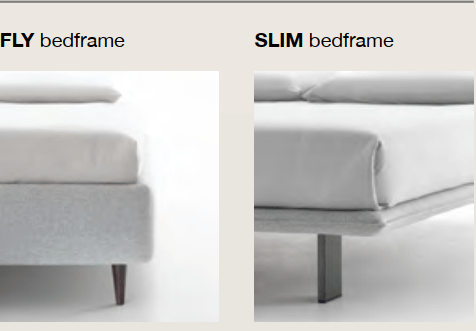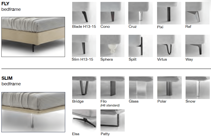 Standard feet, options, and finishes: see the bottom of the following pages. With Slim bed frame, Glass feet set consisting of n.2 Glass feet fixed under the footboard and n.2 Filo feet fixed under the headboard; Elsa sled set consisting of n.1 Elsa sled fixed under the footboard side and n.2 Filo feet fixed under headboard; Patty sled set consisting of n.1 Patty sled fix under footboard side and n.2 Filo feet fix under headboard.
