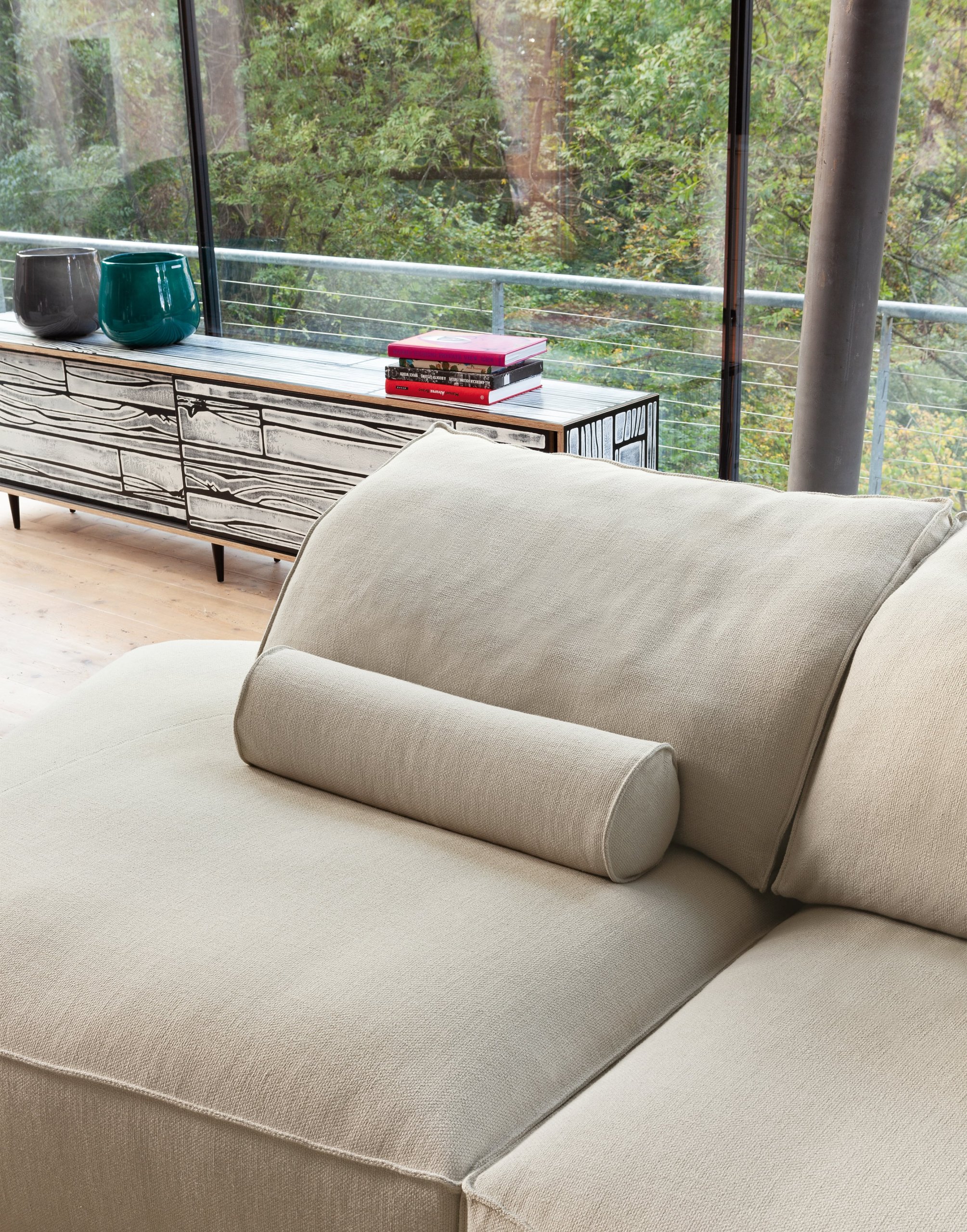 The utmost comfort for a sofa that entirely embraces you. The distinctive feature of Gravity is its sheer comfort, made even more perfect by the roll cushion used as a headrest – inserted under or resting on the back cushion, to which it clings, as in the absence of gravity. You can experience total relaxation alone or in the company of others, everyone in their own way: individual seats that can be pulled out separately and a scatter roll cushion ensure maximum customization for each seat.