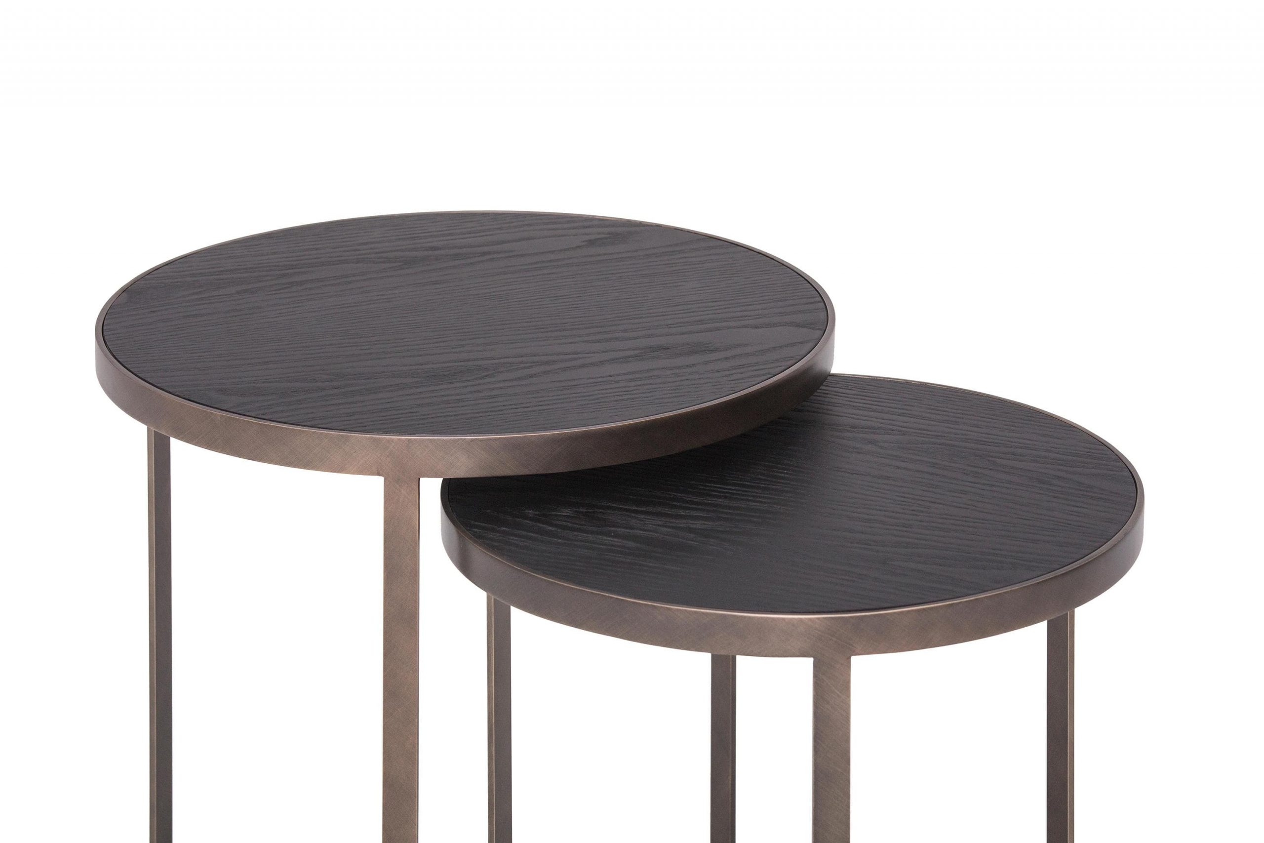 A pair of intersecting side tables to offer maximum functionality without sacrificing design. Brushed bronze metal and wooden tops in our finishes of your choice. Modular coffee table: metal structure and wooden top. Side tables with stone bronze or brushed bronze structure and black ash tops or canaletto walnut.