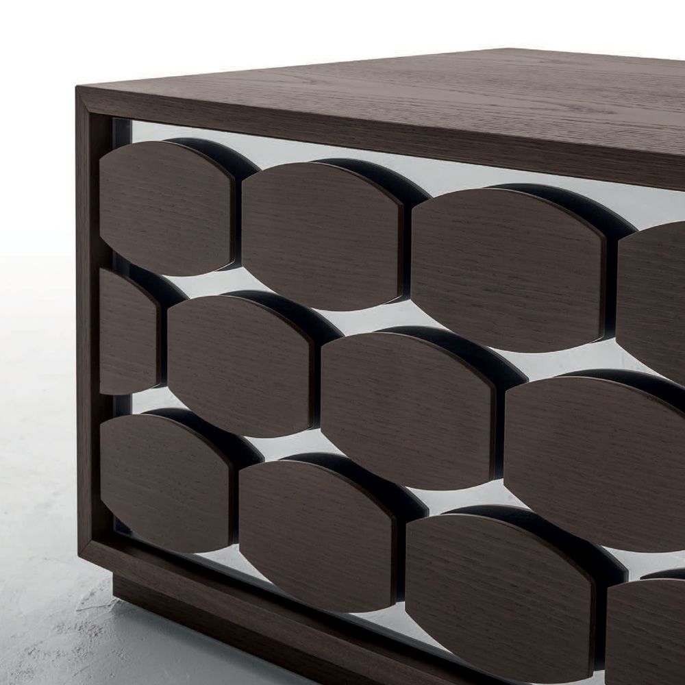 A system for a place to rest, where spaces and lines play a fundamental role. A dresser, a night table and a drawer: Honey Night’s characteristic regards the way we work on the wood. Canaletto walnut and dark, heat-treated oak work together with the mirrors, to amplify the whole room A wood and glass hive, created with intense artisanal dedication. Surfaces that refract on mirrors, empty spaces filled with natural decorations. A spacious drawer to lean on, to better appreciate your most intimate room.