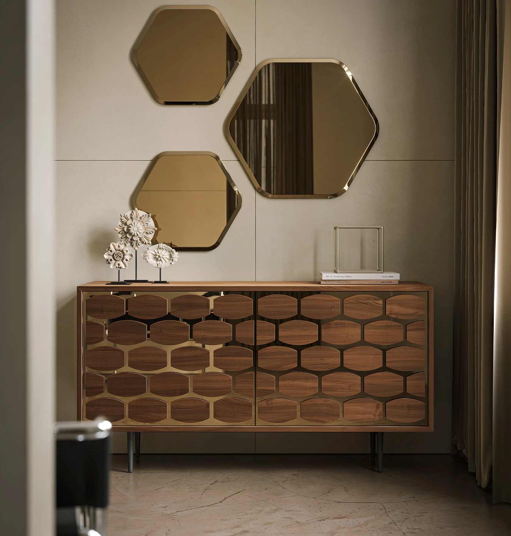A system for a place to rest, where spaces and lines play a fundamental role. A dresser, a night table, a drawer, and sideboards: Honey Night’s characteristic regards Canaletto walnut and dark, heat-treated oak work together with the mirrors to amplify the whole room. A wood and glass hive, created with intense artisanal dedication. Surfaces that refract on mirrors, empty spaces filled with natural decorations. A spacious drawer to lean on, to better appreciate your most intimate room.