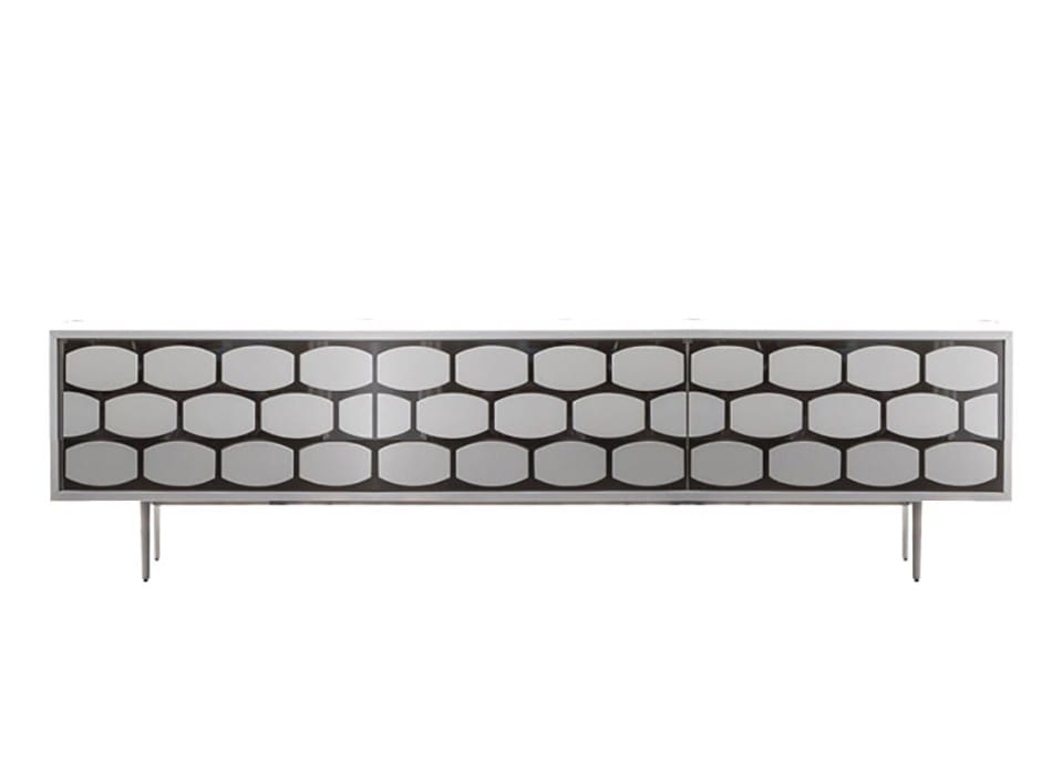 Wood tv stand, 3 drawers with mirror effect and wood elements. Structure in painted or chromed metal