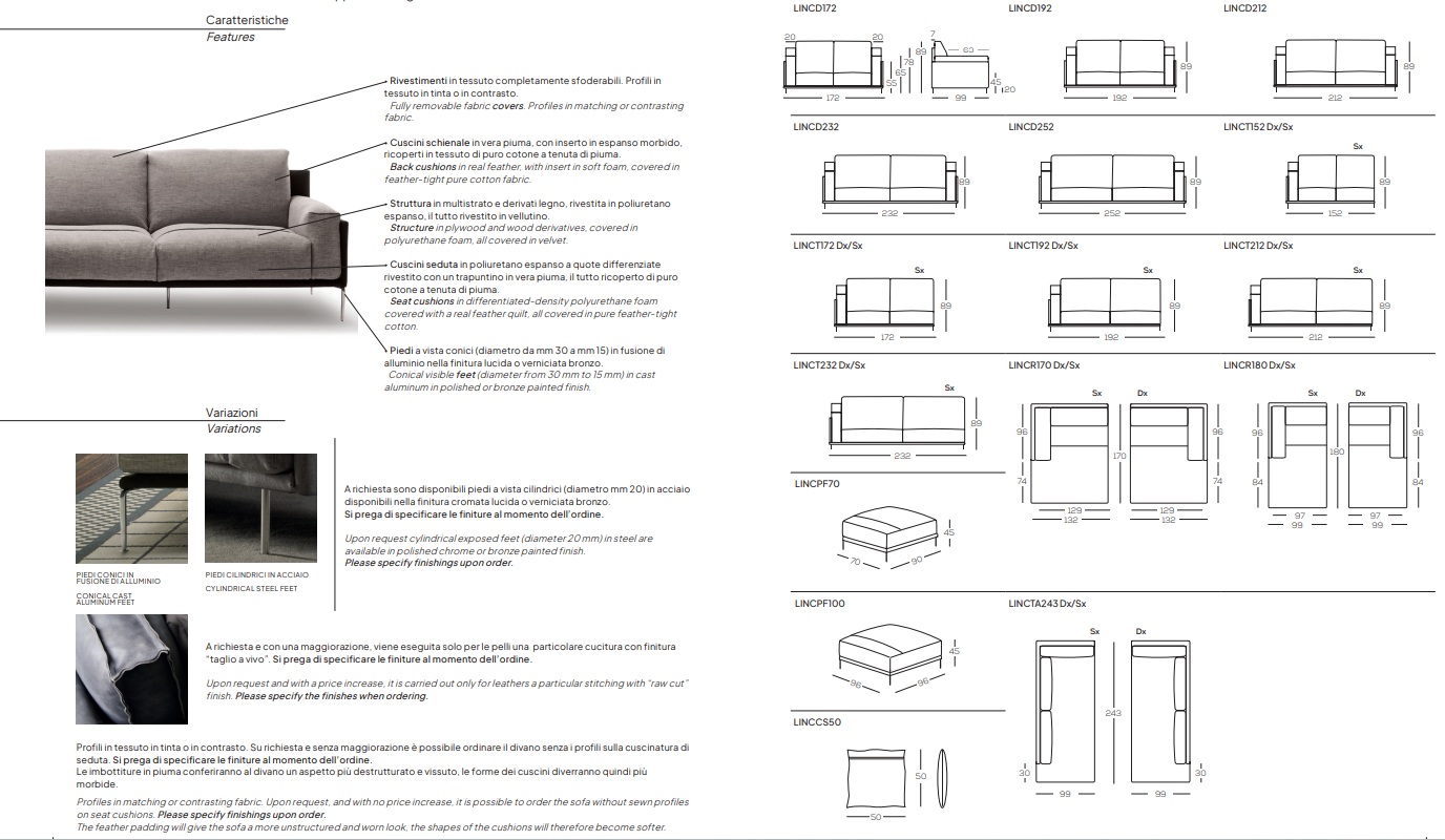Structure in plywood and wood derivatives, covered in polyurethane foam, all covered in velvet. Seat cushions in differentiated-density polyurethane foam covered with a real feather quilt, all covered in pure feather-tight cotton. Back cushions in real feather, with insert in soft foam, covered in feather-tight pure cotton fabric. Fully removable fabric covers. Profiles in matching or contrasting fabric. CONICAL visible feet (diameter from 30 mm to 15 mm) in cast aluminum available in polished or bronze painted finish, or CYLINDRICAL exposed feet (diameter 20 mm) in steel available in polished chrome or bronze painted finish.
