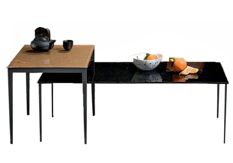 Coffee table and side table with lacquered metal base(carbon grey, stone bronze) and hammered (copper, black, gold) glass or wooden tops. Simple lines that enhance the materiality of the various tops.