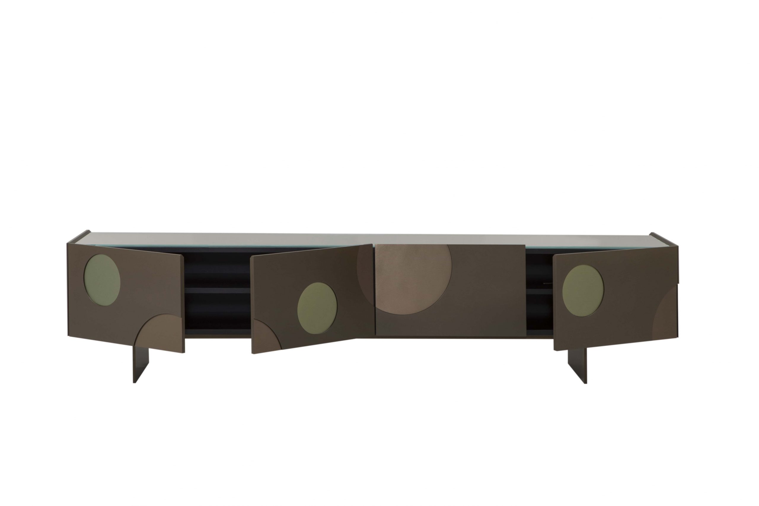 TV cabinet in lacquered wood with 4 doors, with decorative inserts. Base in painted metal