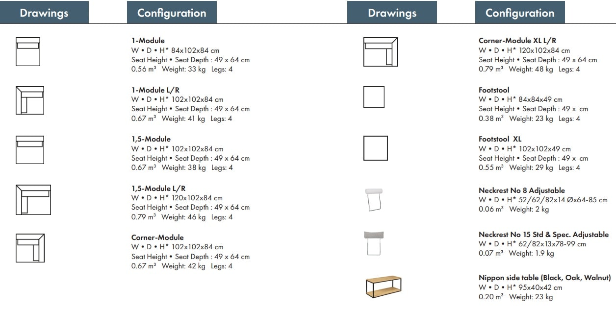 Amount of seats | 1R+footstool XL +1+1L seats sofa, 1R+1L seat sofa, 1 module, 1 module L/R, 1,5 module, 1,5 module L/R, Corner module, Corner module XL, footstool, footstool XL, Neckrest No 15 Std & Spec. Adjustable, Neckrest No 8 Adjustable, Nippon side table (Black, Oak, Walnut) |