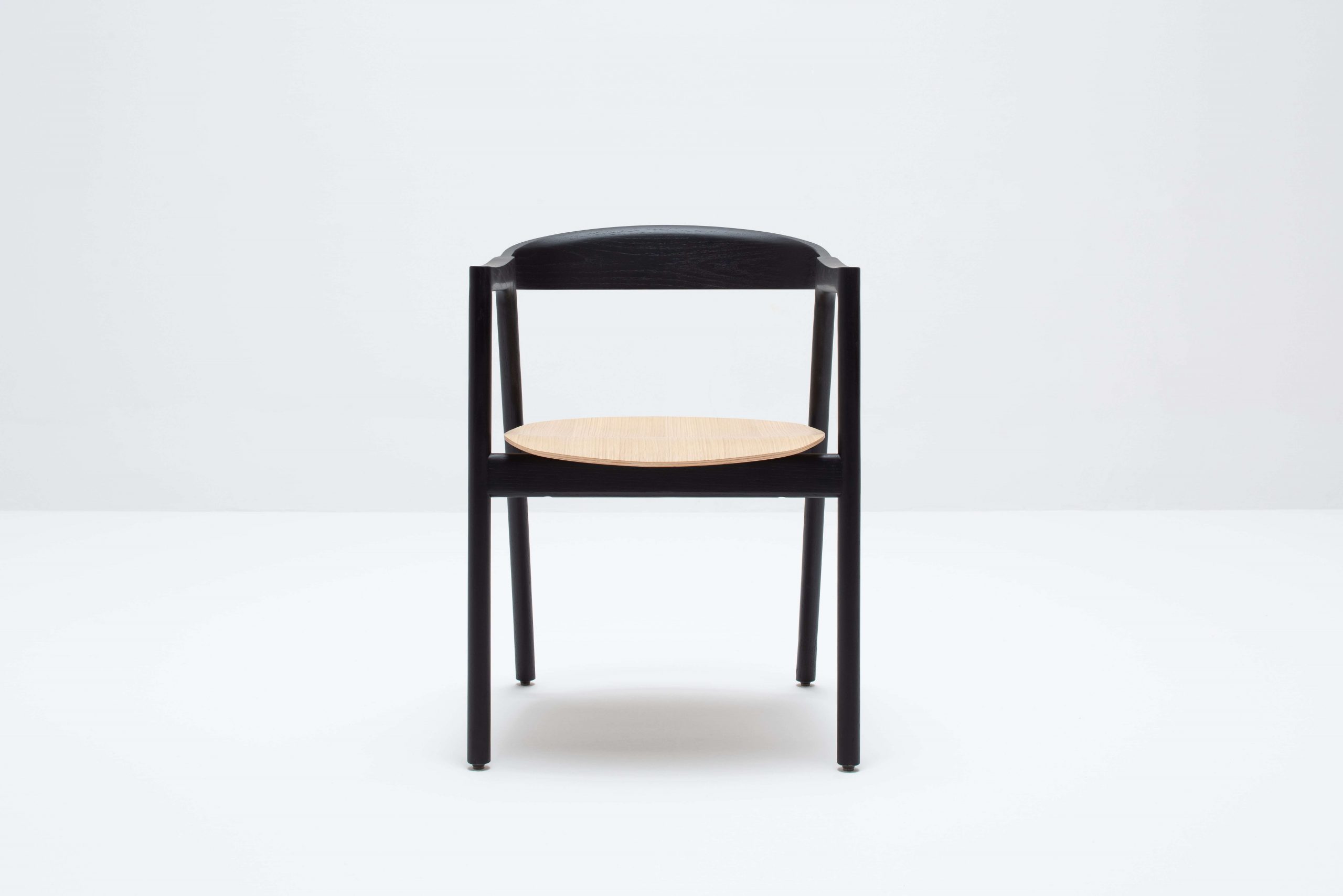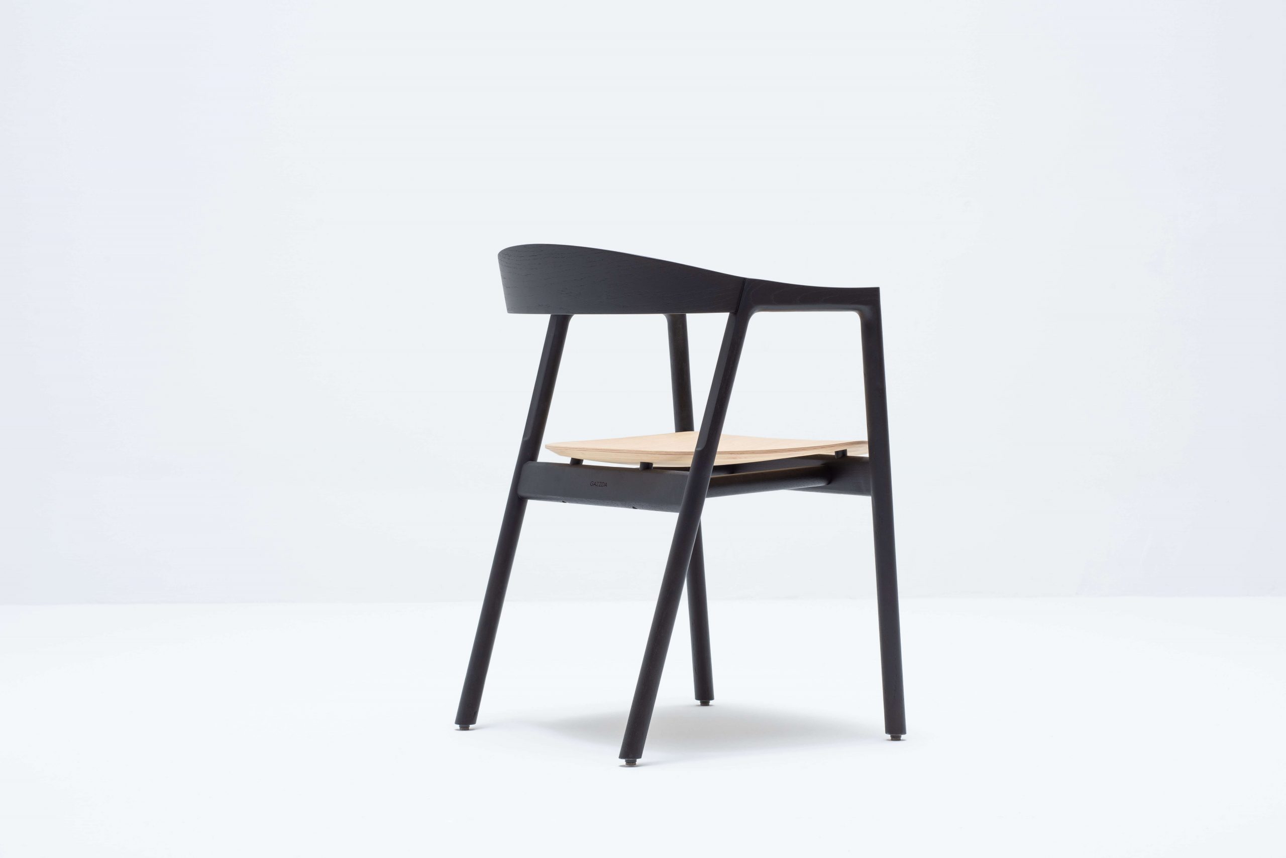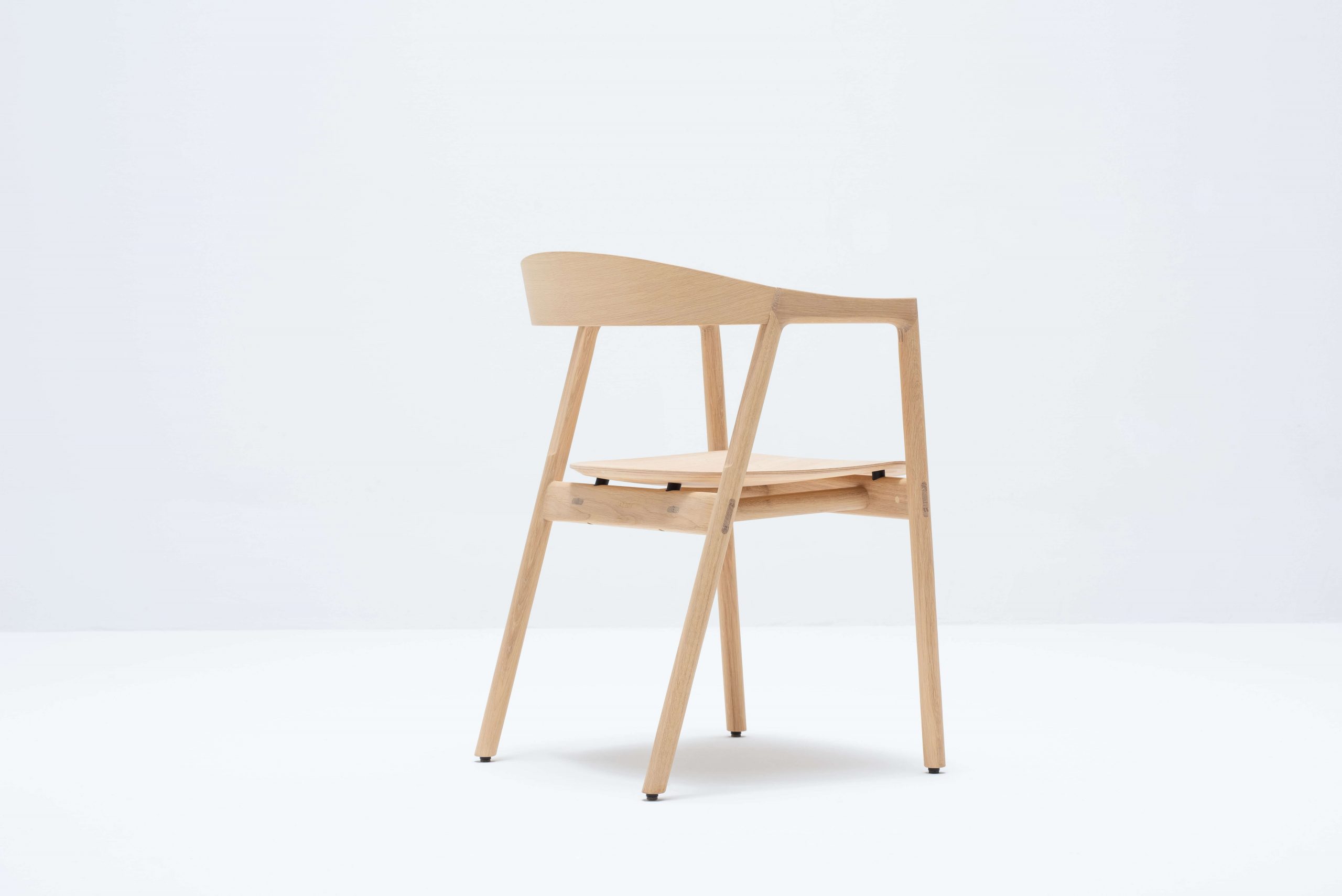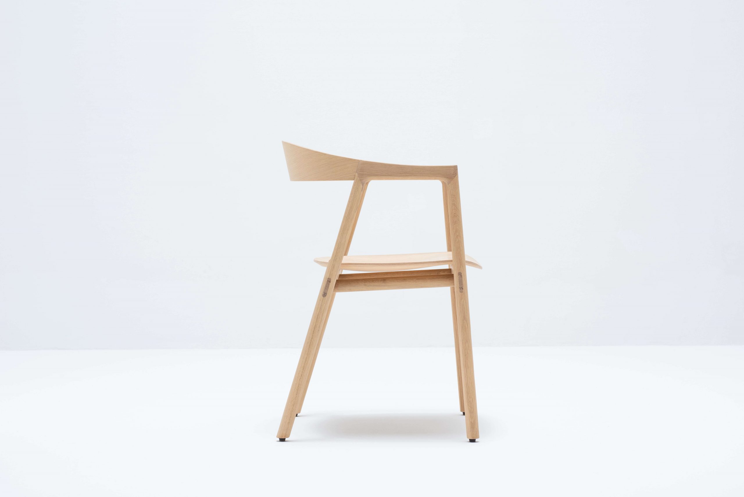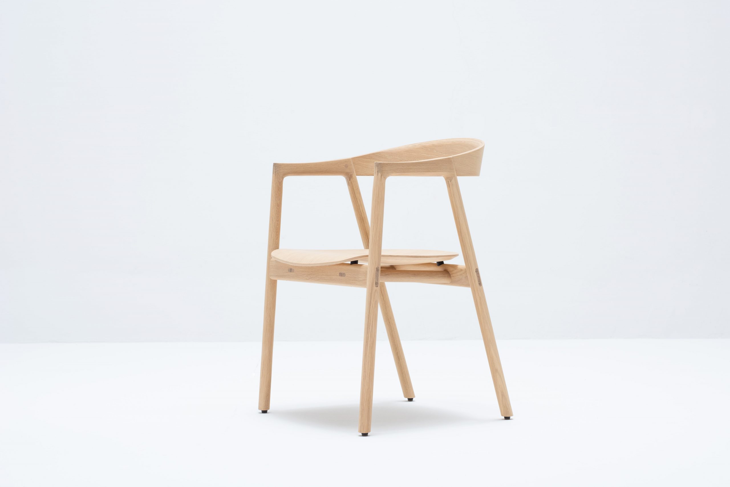 Muna’s body is made out of solid wood, while the bent backrest is made out of thin veneer slices of high-quality oak. Chair elements are connected with characteristic and visible wedged mortise and tenon joints. Felten gliders are attached to the chair legs and are suitable for most flooring options. The seat is attached to the body through matte black plastic seat spacers.
