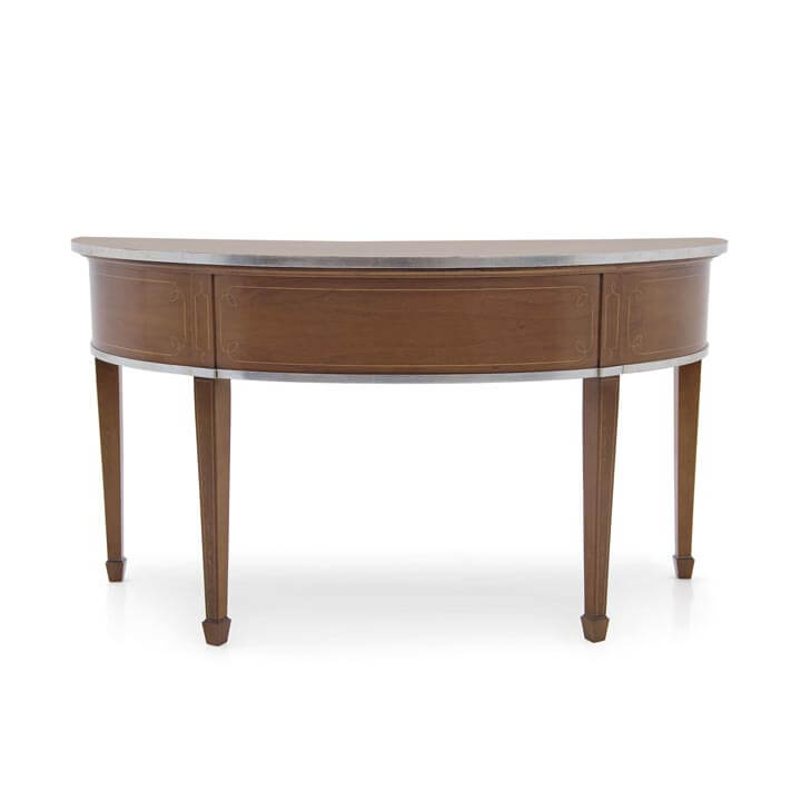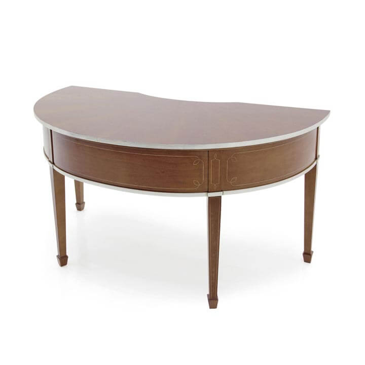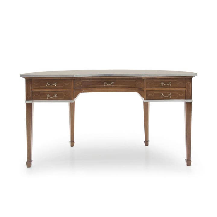 Elegant writing desk with beech wood structure in the directoire style with very particular lines. It has numerous inlays along the entire surface which makes it a unique product. It is equipped with five drawers and for this product we recommend a non-covering polishing that allows the inlays to show through.