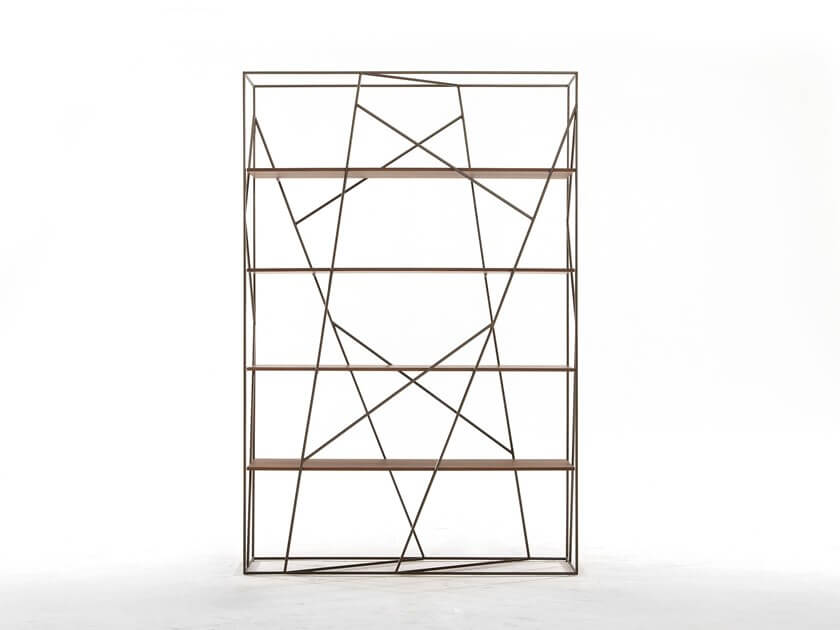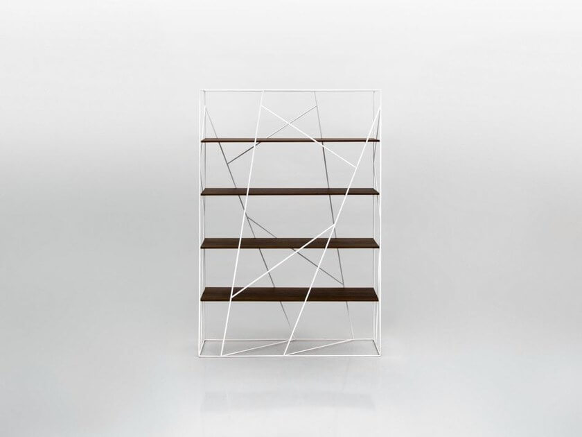 Naviglio is a whole made of lines, precise and geometric, rigid and regular, forming a peculiar mosaic of discontinued spaces. Painted metal melts with the wooden, or glass shelves, and reaches a perfect balance of shapes and spaces. Lacquered metal(Matt white, Matt black, Stone bronze) bookcase with wood(Canaletto walnut, Natural oak, Smoked oak heat-treated) or glass (Painted black glass, Extra clear white glass) shelves.