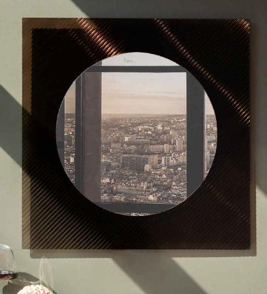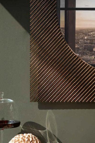 The Otello wall mirror blends two opposite shapes through a particular striped processing of the frame, embellished with a cannetè texture with oblique lines: the finishes of the ribbed glass in relief give three-dimensionality and enhance the mirror element, making it a unique design object.