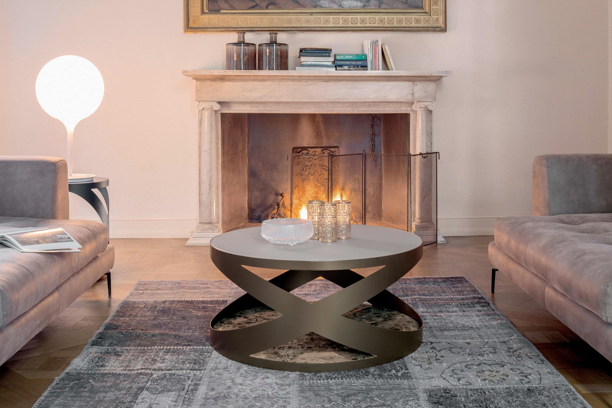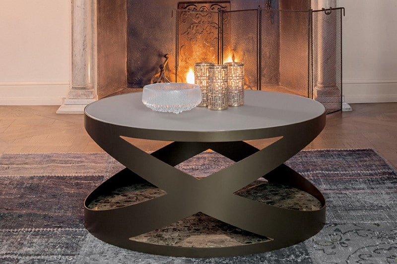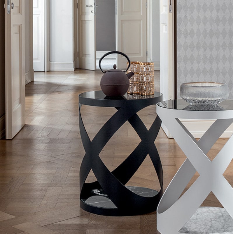 A coffee table and a side table, capable of moving and amaze just like a dining table: Rimini standsout everywhere, thanks to its metal structure’s peculiar design, to its base’s Italian marble richness, and to the varnished and acid-etched glass top. Three different materials on just one object offer you a huge range of combinations: white, black or bronze metal; white Carrara, black Marquinio, Emperador bronze marbles; transparent grey, black, white and beige acid-etched glass.