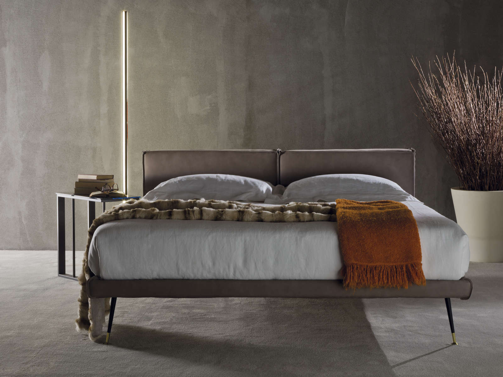 Slatted base in evaporated beech wood with central part with adjustable support. In the version with box, the bed base is equipped with a lifting mechanism and a mattress retaining bracket. Exposed feet in die-cast light alloy with height adjustment, available in the linear or curved version.