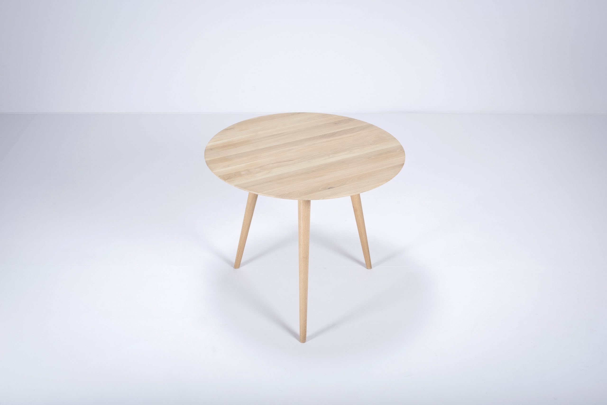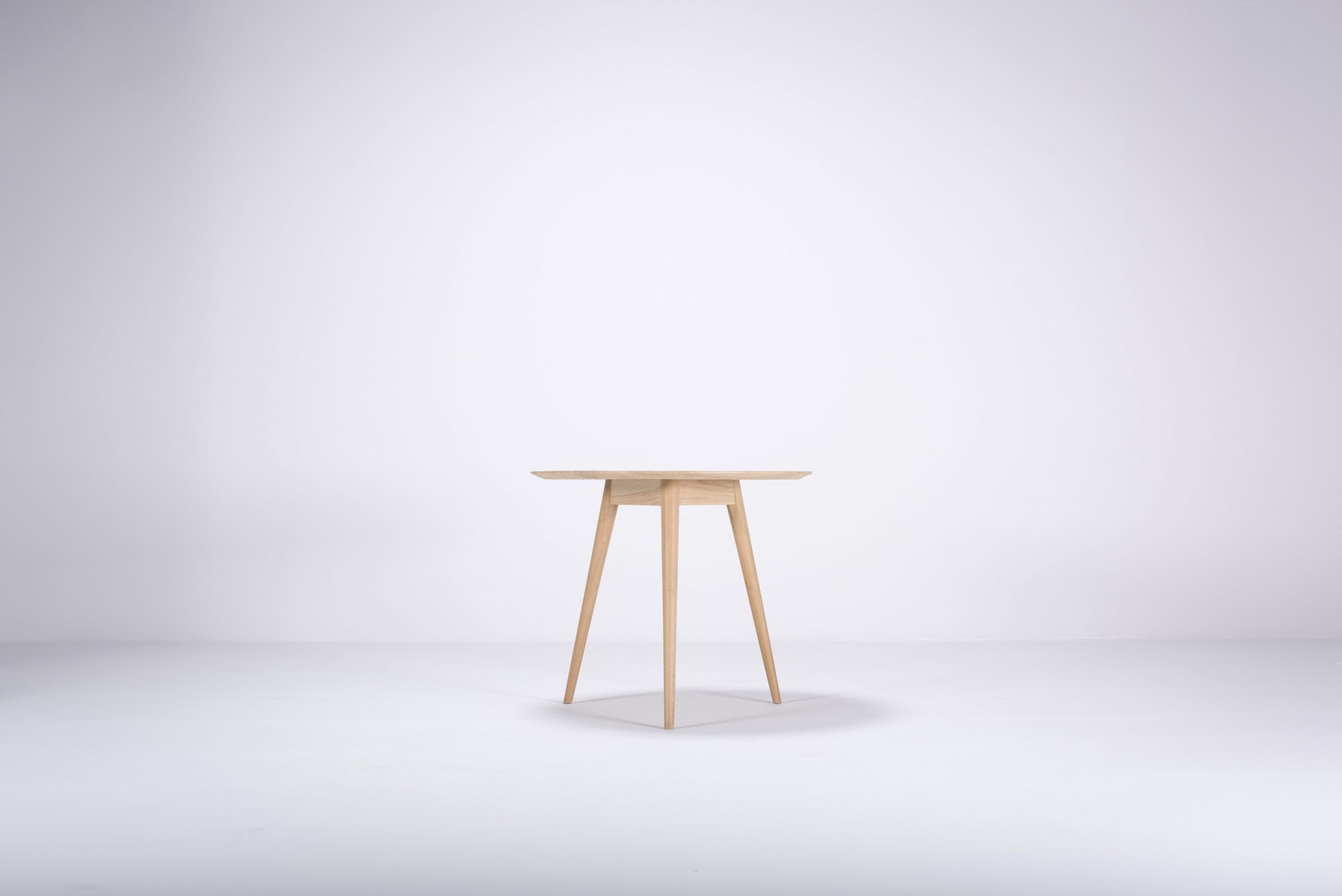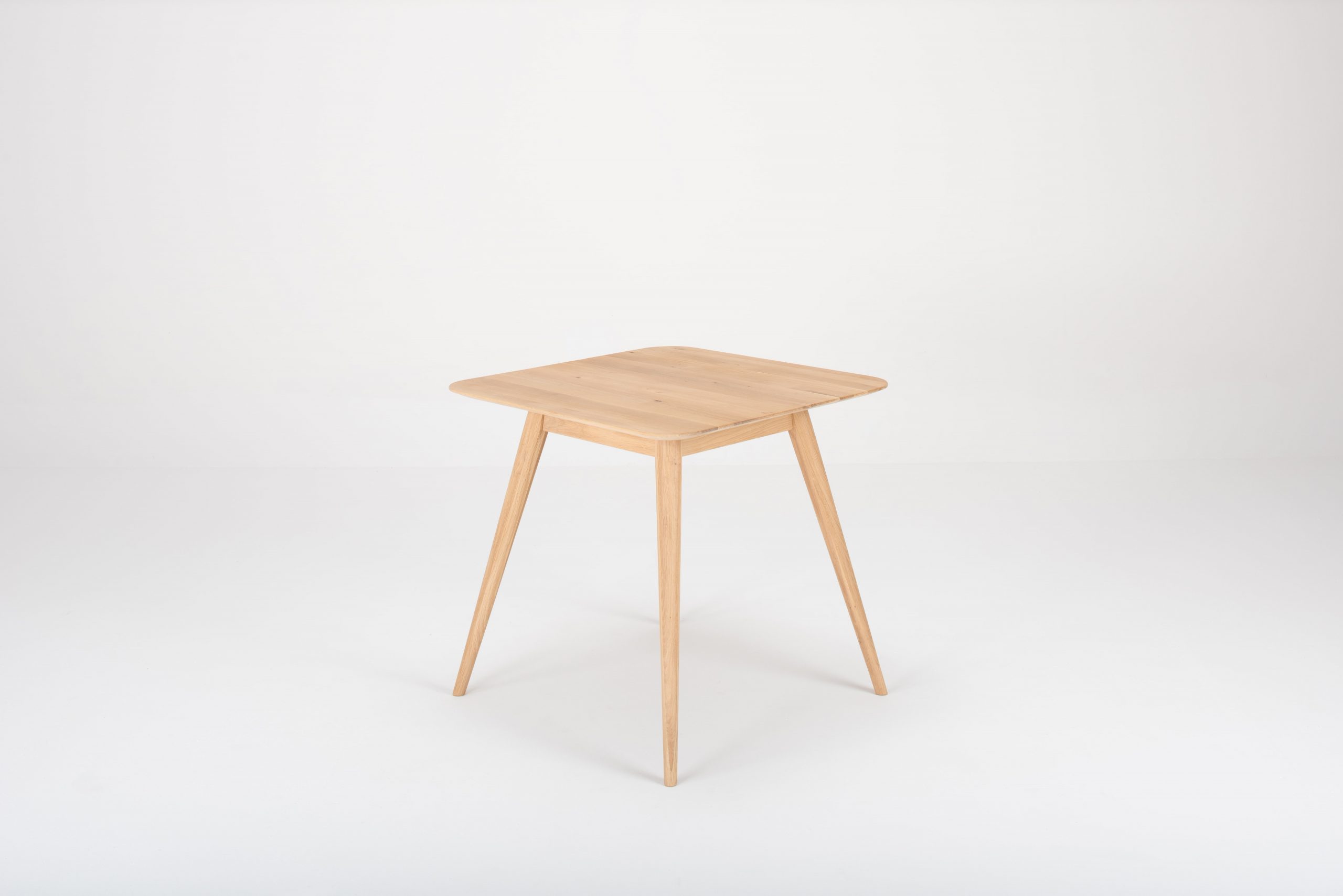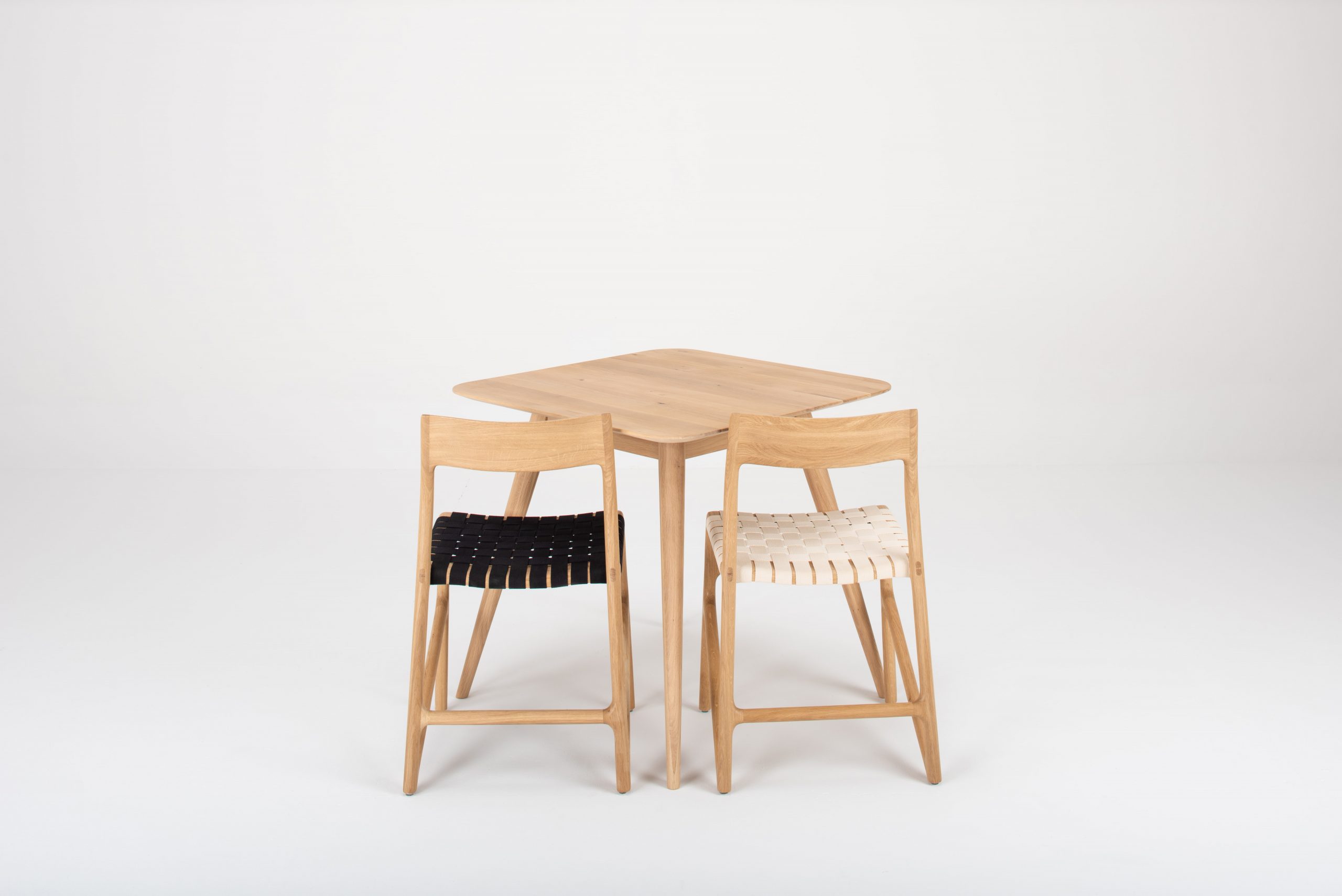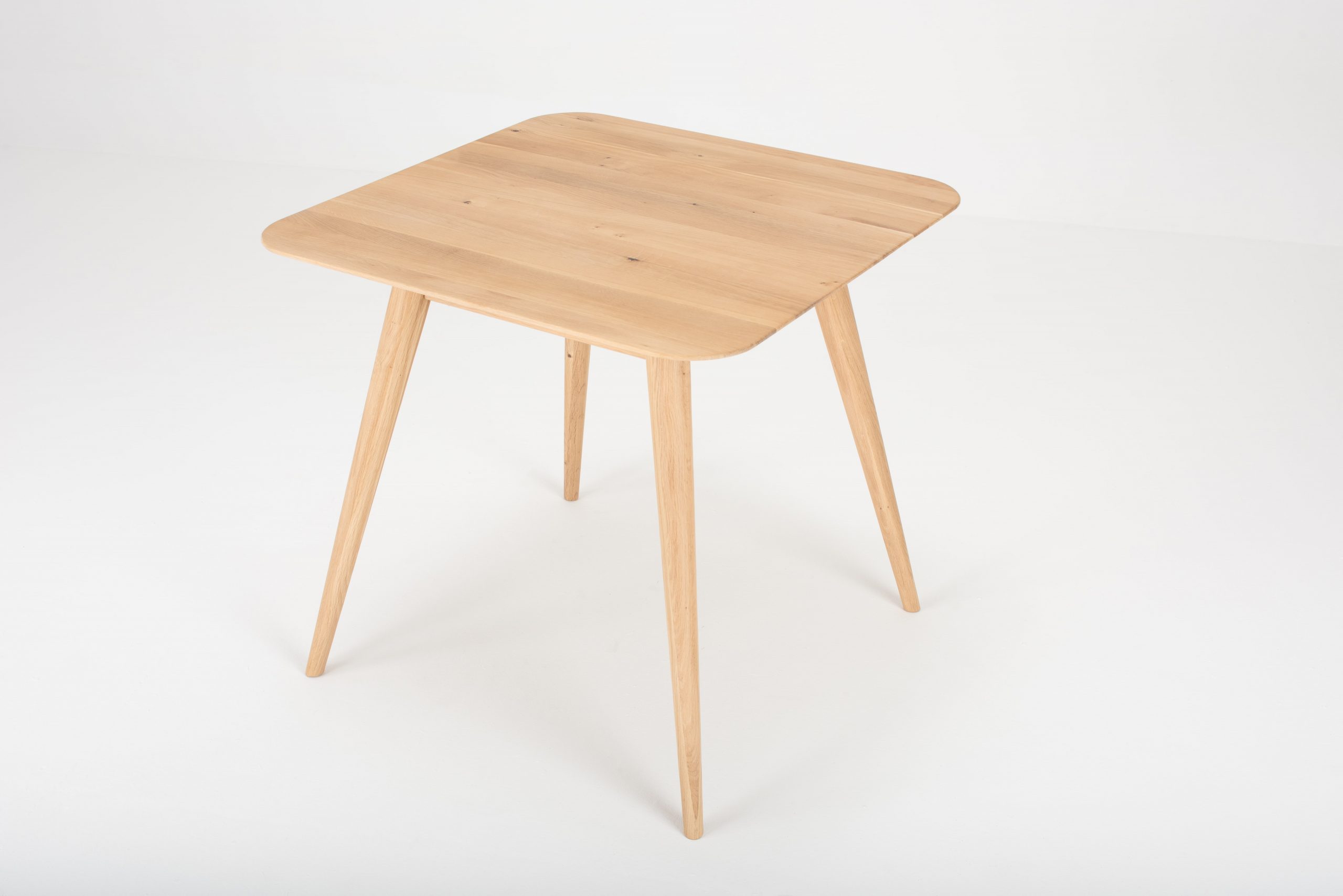 The Stafa table plate is fully made out of solid wood - oak or desktop linoleum (natural, warm to the touch, smooth, antibacterial surface material) glued on beech plywood. The solid oak plate option has steel stiffeners at the bottom side of the plate which prevent minor changes in the dimensions of the wooden parts over time due to the hygroscopy.
