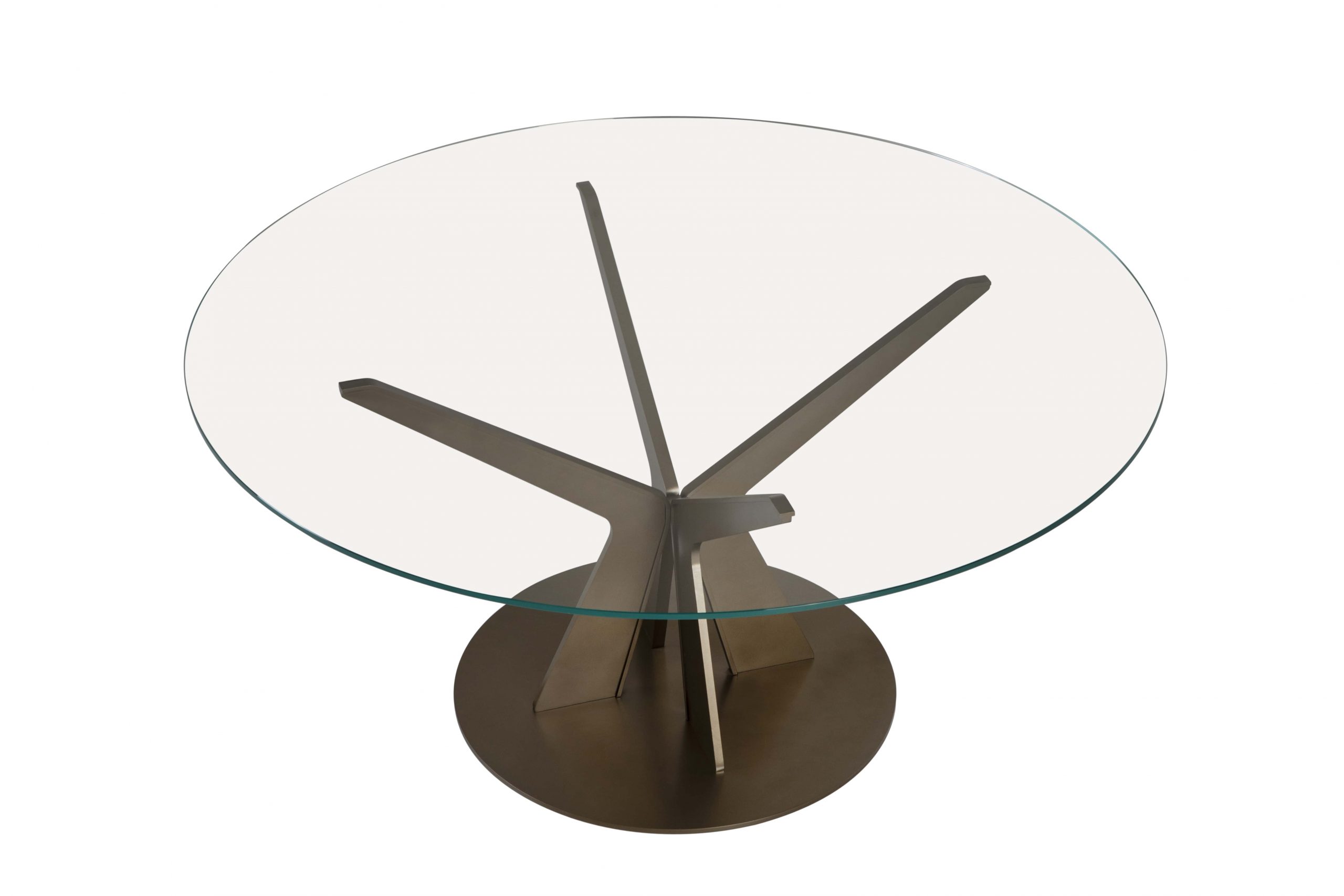 The twisting of the various metal elements which constitute the base of the Tree table, creates a particular visual rotation movement around its own axis. This new perspective calls for a unique refinement with a timeless design. Fixed table: lacquered metal base and tempered glass top (round or oval)