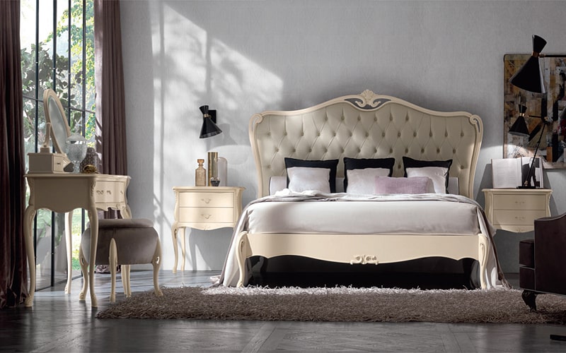Night, a time of rest and intimacy, can be imbued with light and brilliance. For the discerning customer who desires bright, extroverted furnishings, Valpolicella is also available in a powder version. The forms and decorations that mark out the collection remain intact; it is the lacquering and fabrics that bring to the room an overall carefree, fresh feel. This selection in the concept enables a combination of contrasting colours, accentuating the dynamic, vivacious character of the interpretation.