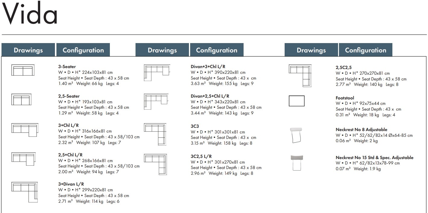 Size | 2,5 seater sofa, 2,5+CHL seater, 2,5C2,5 corner, 3 seater sofa, 3+CHL seater, 3+Divan L/R, 3C2,5 L/R corner, 3C3 corner, Divan+2,5+Chl L/R, Divan+3+Chl L/R, footstool |